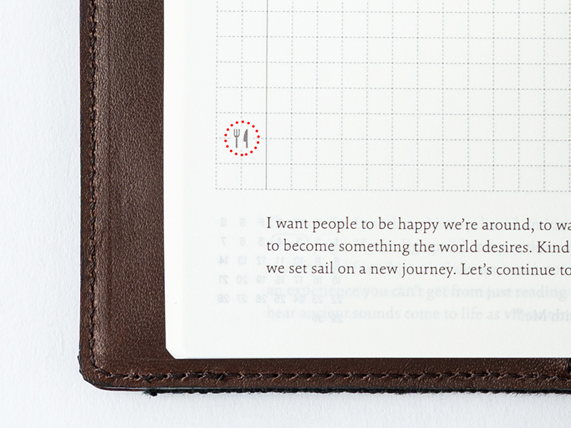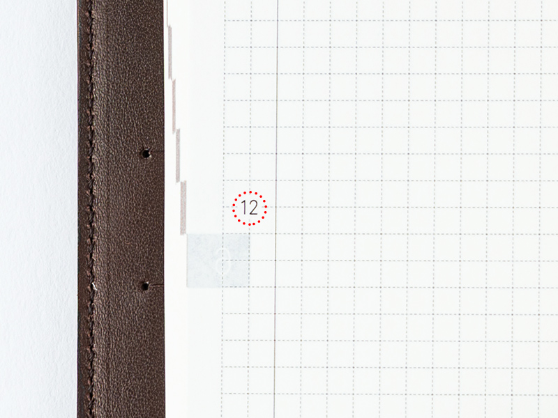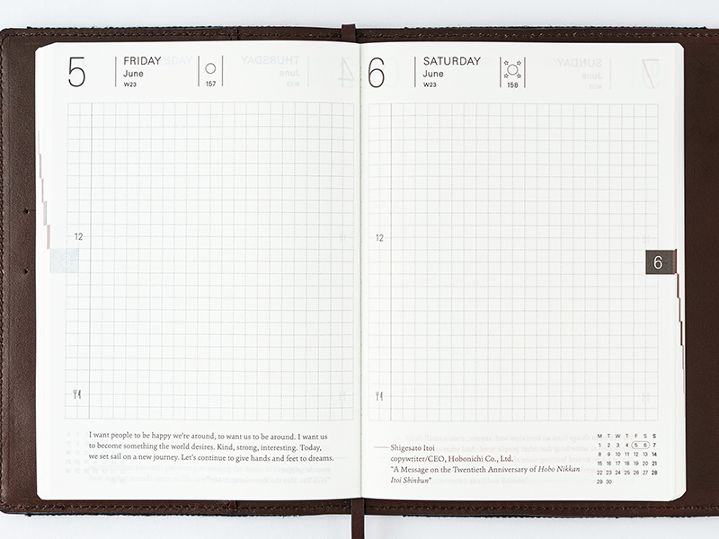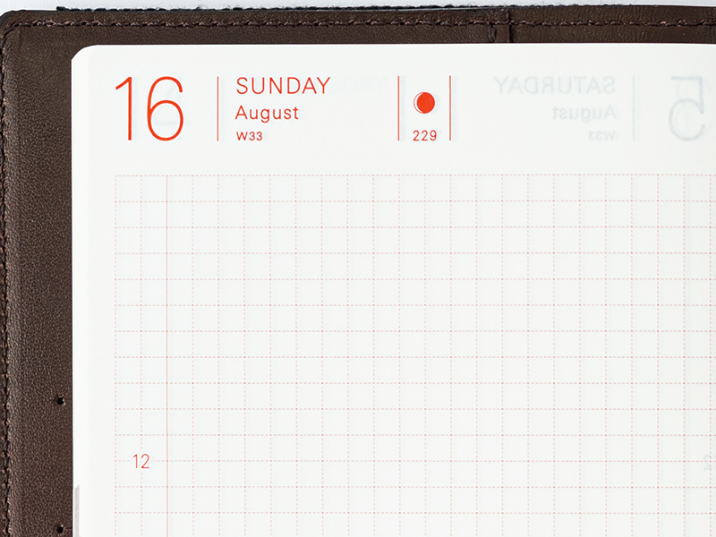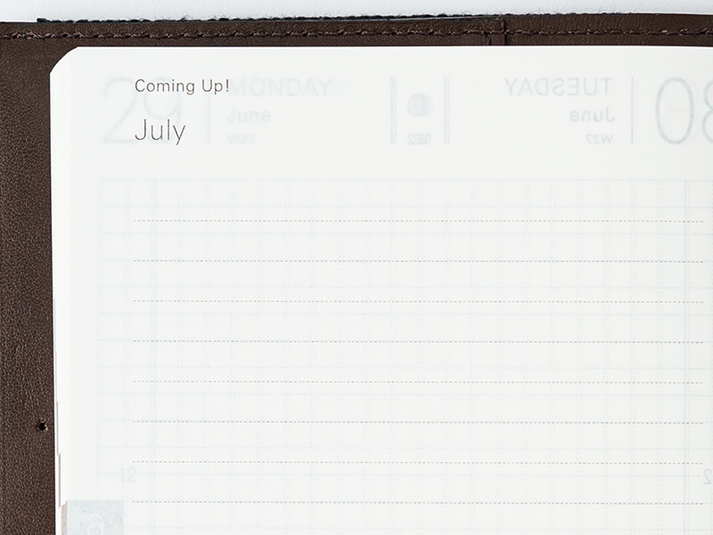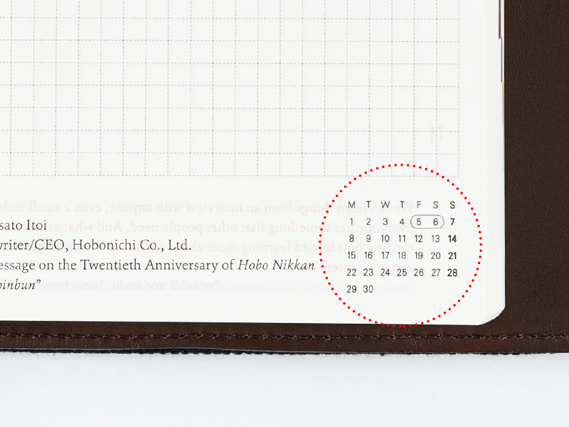 1ヵ月ごとの区切りがわかりやすいように、辞書のような各月のツメをつけました。チャコールグレーは平日、赤色は日曜を表しています。
