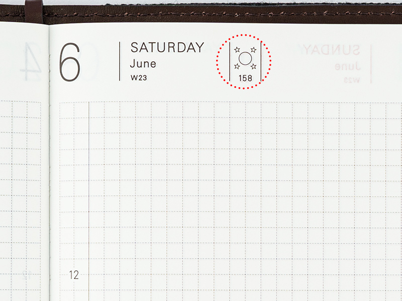 1月1日から数えて何日目であるかを表した「日番号」と、日本でその日に見られる月の形を記載しています。