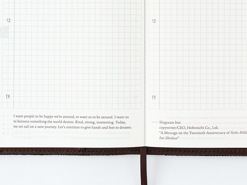 「ほぼ日刊イトイ新聞」のコンテンツからPlannerのために厳選した言葉や、 「ARTS&SCIENCE」のオーナーであるソニア パークさんの言葉などを、見開きにひとつ、英語で掲載しています。