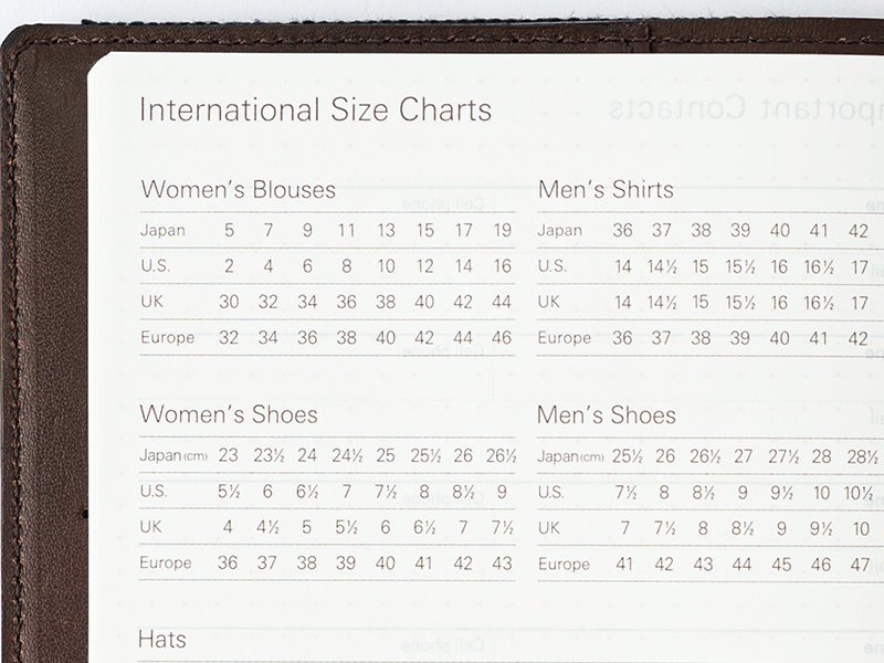 洋服、靴、帽子、指輪について、日本、アメリカ、イギリス、ヨーロッパのサイズ表記を比較して記載しています。