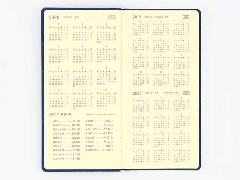 2019年、2020年、2021年の3年分のカレンダーを見開きで掲載しています。わかりやすいように「去年」「今年」「来年」の表記も入れています。