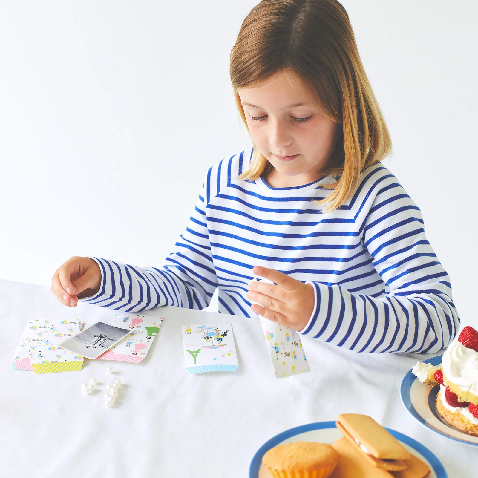 裏面には、それぞれ水色、黄色、ピンクの縞模様と、