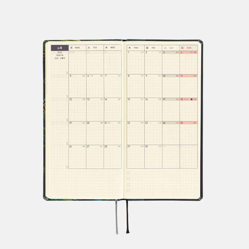 | 紙質・製本 | 薄くて軽く、裏抜けの少ないトモエリバー(手帳専用紙)/糸かがり製本 |