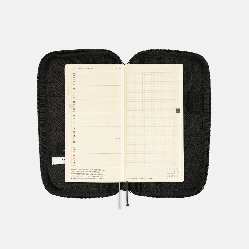 手帳といっしょに文房具や書類、カードなどを持ち運べるように設計されていますが、容量を超える収納はお避けください。