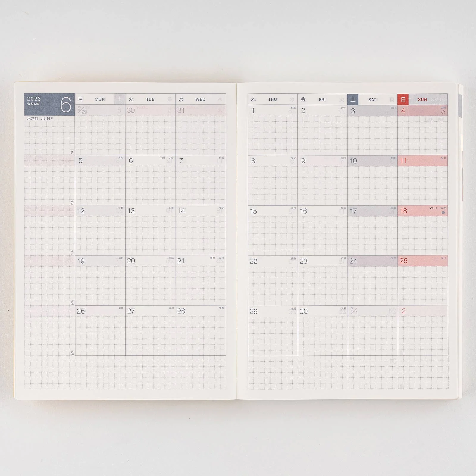| 記載される内容 | 日番号/週番号(月間カレンダー・週間ダイアリーに記載)/旧暦/六曜(大安、仏滅など)(月間カレンダーに記載)/二十四節気(立春、春分、夏至など)、雑節/祝日、記念日など(バレンタインデー、ひなまつり、母の日、父の日など)/月の満ち欠け(1日ページ全ページに記載、月間カレンダー・週間ダイアリーに満月と新月のみ記載) |