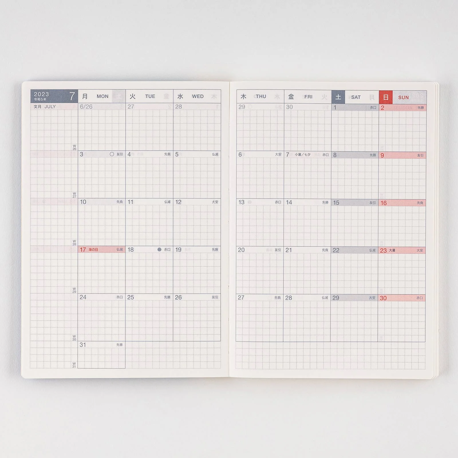 | 記載される内容 | 日番号/週番号(月間カレンダーに記載)/旧暦/六曜(大安、仏滅など)(月間カレンダーに記載)/二十四節気(立春、春分、夏至など)、雑節/祝日、記念日など(バレンタインデー、ひなまつり、母の日、父の日など)/月の満ち欠け(月間カレンダーに満月と新月のみ記載) |