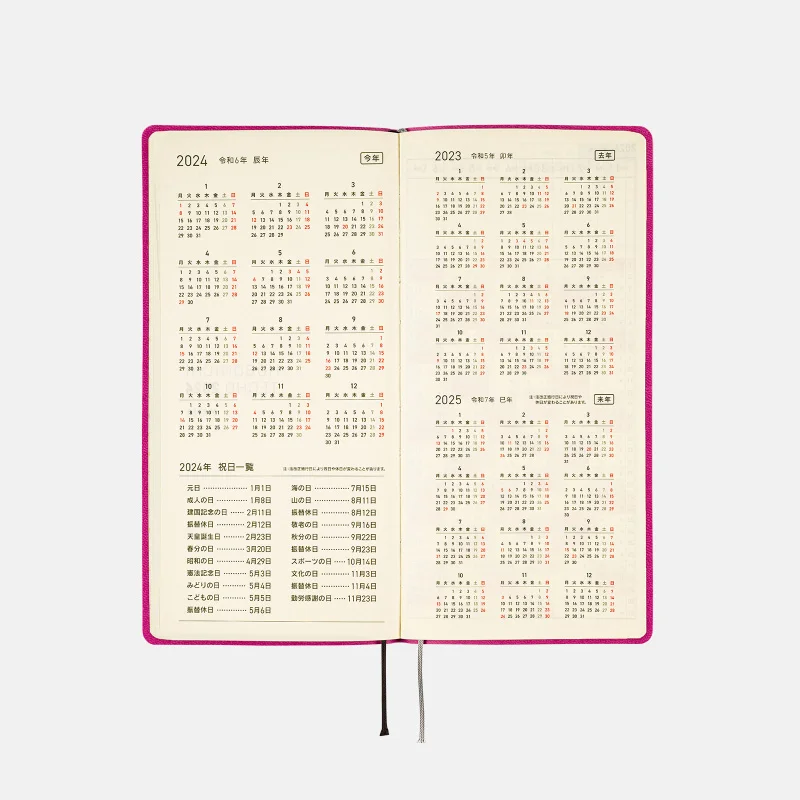 | 記載される内容 | 週番号/六曜(大安、仏滅など)/二十四節気(立春、春分、夏至など)/祝日、記念日など(バレンタインデー、ひなまつり、母の日、父の日など)/月の満ち欠け(週間ページ全てに記載・月間カレンダーに満月と新月のみ記載) |
