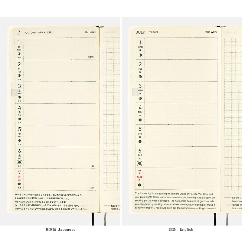 | 記載される内容 | 週番号/月の満ち欠け(週間ページ全てに記載・月間カレンダーに満月と新月のみ記載) ※祝日の記載はありません |