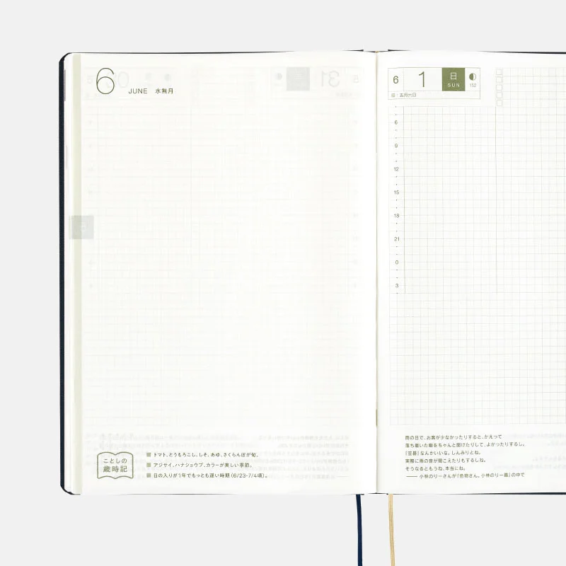 | 記載される内容 | 日番号/週番号(月間カレンダー・週間ダイアリーに記載)/旧暦/六曜(大安、仏滅など)(月間カレンダーに記載)/二十四節気(立春、春分、夏至など)、雑節/祝日、記念日など(バレンタインデー、ひなまつり、母の日、父の日など)/月の満ち欠け(1日ページ全ページに記載、月間カレンダー・週間ダイアリーに満月と新月のみ記載) |