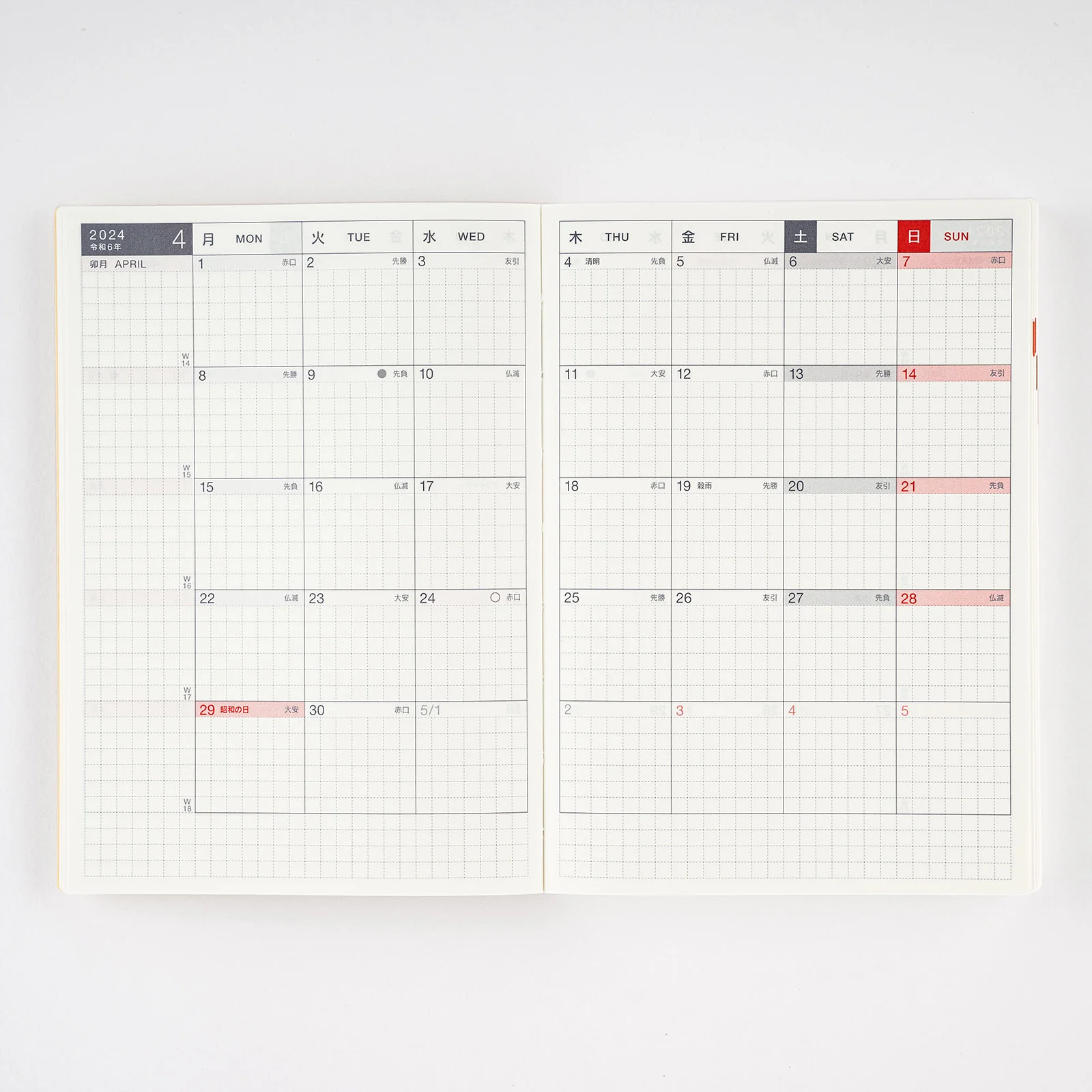 | 記載される内容 | 日番号/週番号(月間カレンダーに記載)/旧暦/六曜(大安、仏滅など)(月間カレンダーに記載)/二十四節気(立春、春分、夏至など)、雑節/祝日、記念日など(バレンタインデー、ひなまつり、母の日、父の日など)/月の満ち欠け(1日ページ全ページに記載、月間カレンダーに満月と新月のみ記載) |