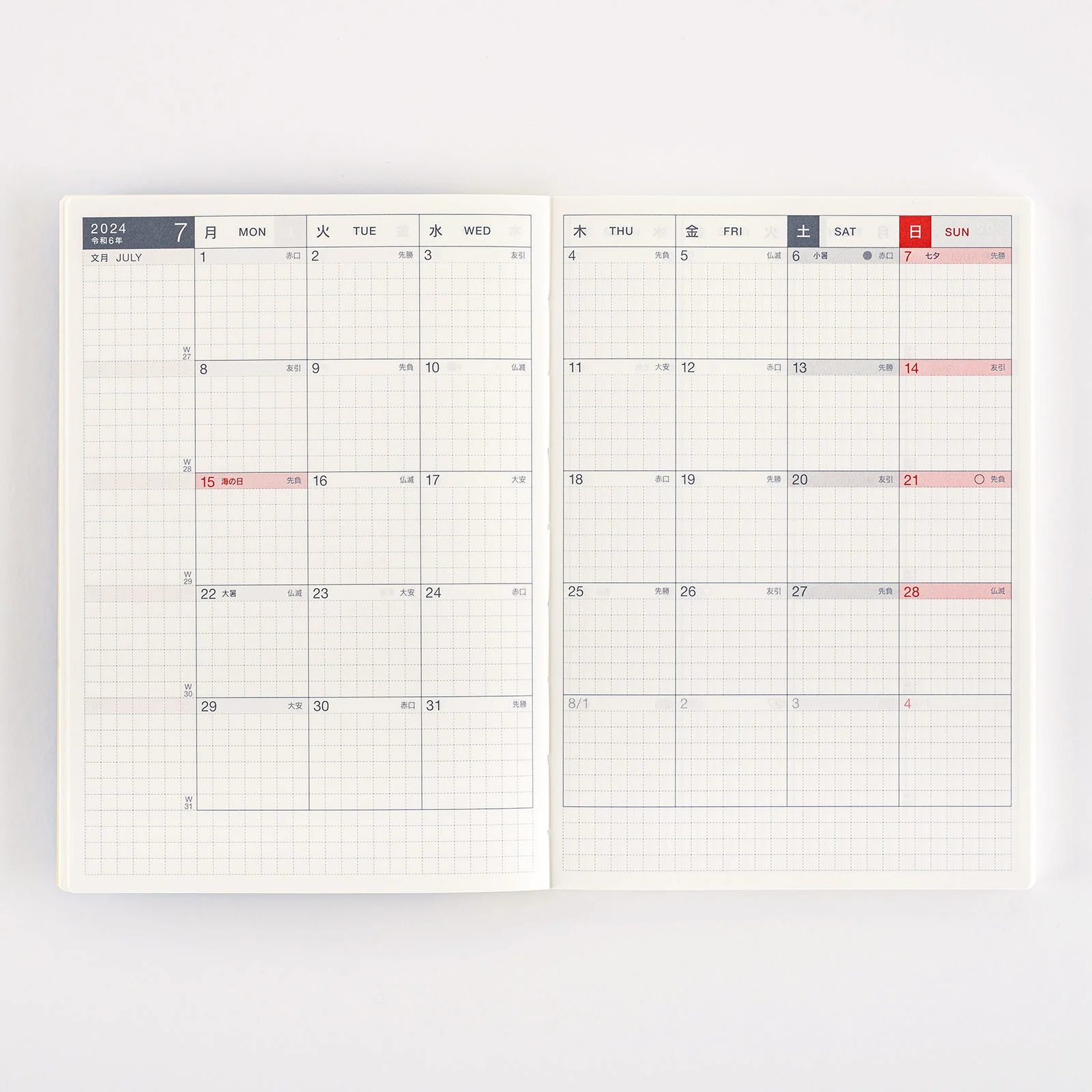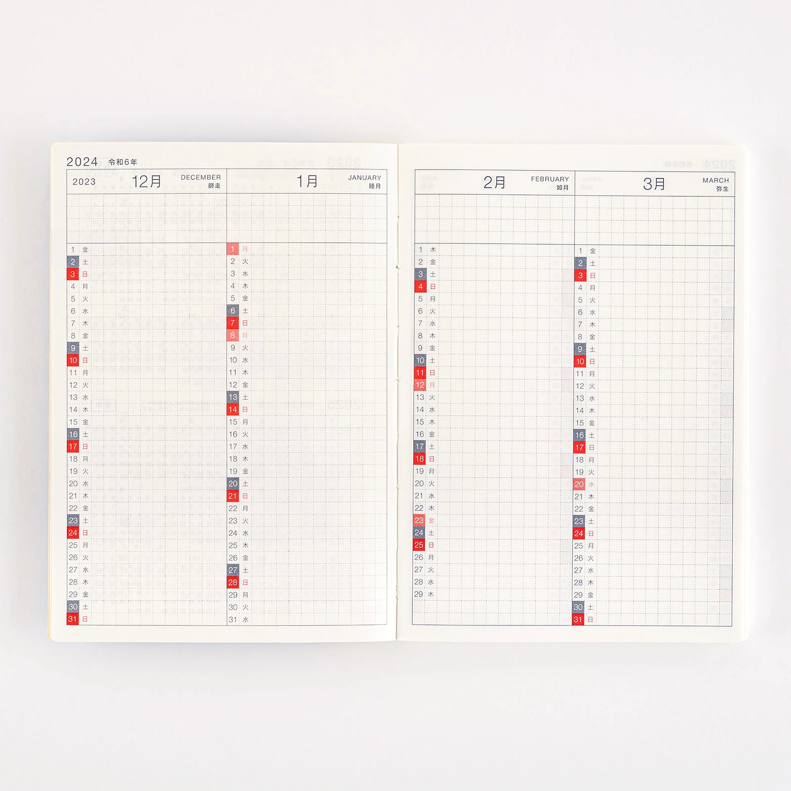 | 紙質・製本 | 薄くて軽く、裏抜けの少ないトモエリバーS(手帳専用紙)/糸かがり製本 |