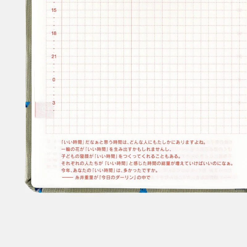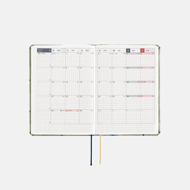 | 1日ページ | 2025年1月1日〜12月31日(全377ページ) *手帳の使いはじめに、自由に使えるウォーミングアップ用ページ(2ページ)があります。 *各月のはじめに、「ことしの歳時記」と、その月のことをまとめて書ける扉ページ(1ページ)があります。 *すべてのページに「日々の言葉」を掲載。 *右ページに「ミニカレンダー」を掲載(月曜もしくは日曜はじまり)。 |
