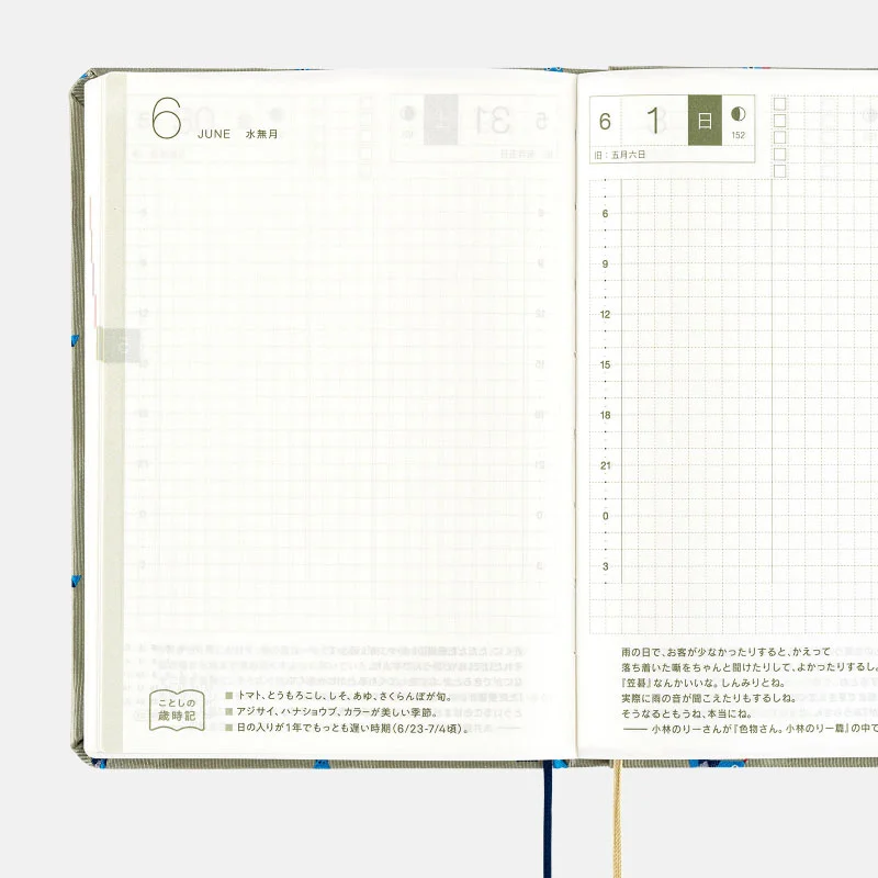 | 記載される内容 | 日番号/週番号(月間カレンダーに記載)/旧暦/六曜(大安、仏滅など)(月間カレンダーに記載)/二十四節気(立春、春分、夏至など)、雑節/祝日、記念日など(バレンタインデー、ひなまつり、母の日、父の日など)/月の満ち欠け(1日ページ全ページに記載、月間カレンダーに満月と新月のみ記載) |