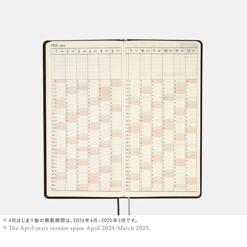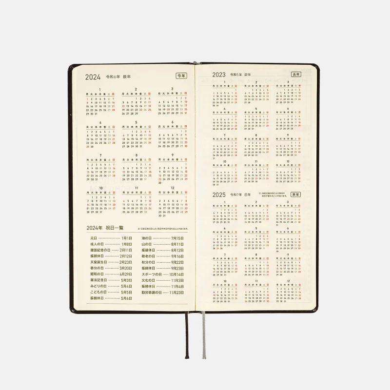| 記載される内容 | 週番号/六曜(大安、仏滅など)/二十四節気(立春、春分、夏至など)/祝日、記念日など(バレンタインデー、ひなまつり、母の日、父の日など)/月の満ち欠け(週間ページ全てに記載・月間カレンダーに満月と新月のみ記載) |