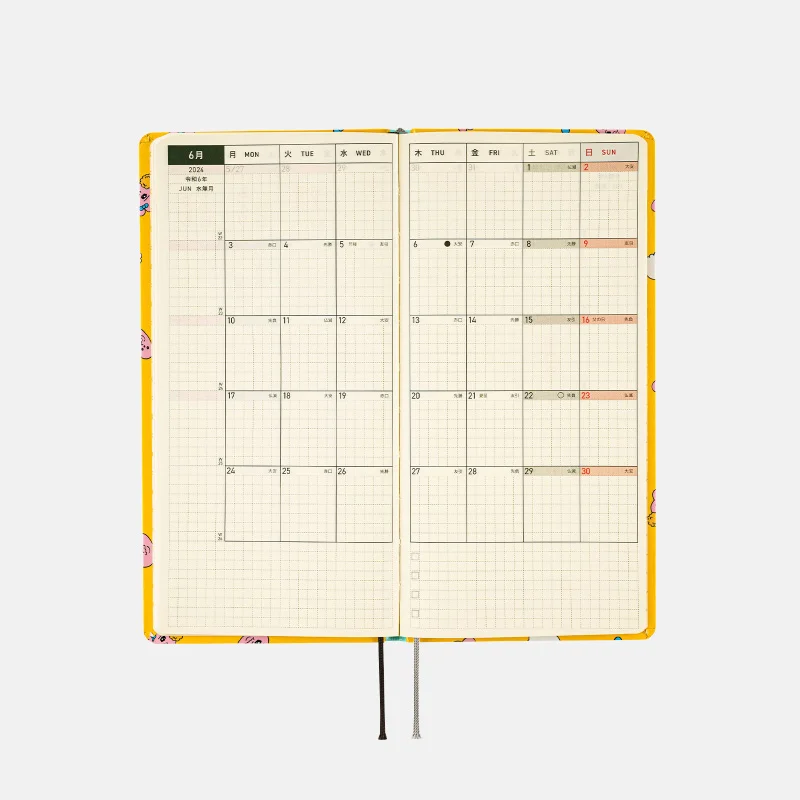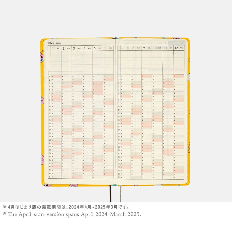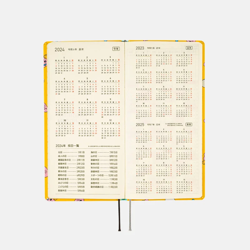 記載される内容週番号/六曜(大安、仏滅など)/二十四節気(立春、春分、夏至など)/祝日、記念日など(バレンタインデー、ひなまつり、母の日、父の日など)/月の満ち欠け(週間ページ全てに記載・月間カレンダーに満月と新月のみ記載)