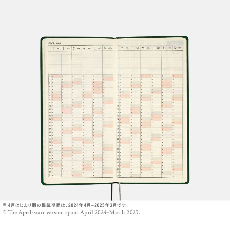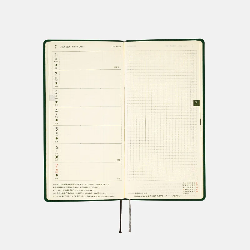 | 記載される内容 | 週番号/六曜(大安、仏滅など)/二十四節気(立春、春分、夏至など)/祝日、記念日など(バレンタインデー、ひなまつり、母の日、父の日など)/月の満ち欠け(週間ページ全てに記載・月間カレンダーに満月と新月のみ記載) |