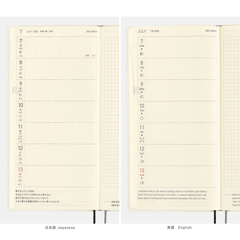 | 記載される内容 | 週番号/月の満ち欠け(週間ページ全てに記載・月間カレンダーに満月と新月のみ記載) ※祝日の記載はありません。 |
