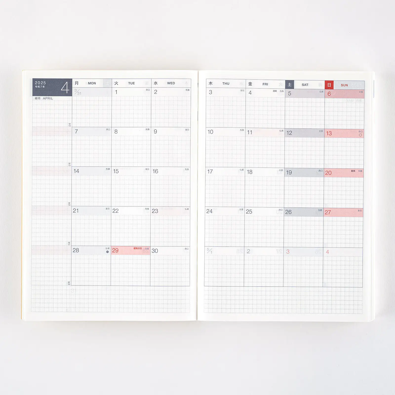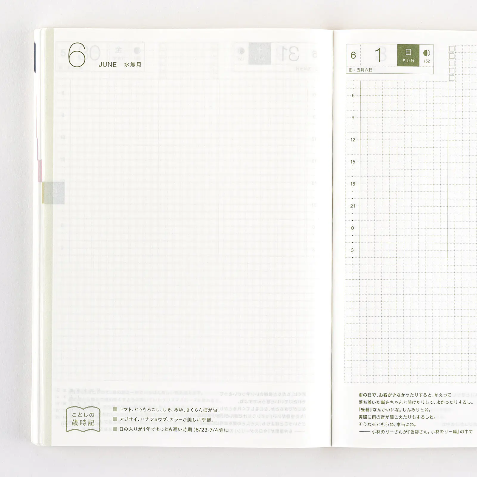 記載される内容日番号/週番号(月間カレンダー・週間ダイアリーに記載)/旧暦/六曜(大安、仏滅など)(月間カレンダーに記載)/二十四節気(立春、春分、夏至など)、雑節/祝日、記念日など(バレンタインデー、ひなまつり、母の日、父の日など)/月の満ち欠け(1日ページ全ページに記載、月間カレンダー・週間ダイアリーに満月と新月のみ記載)