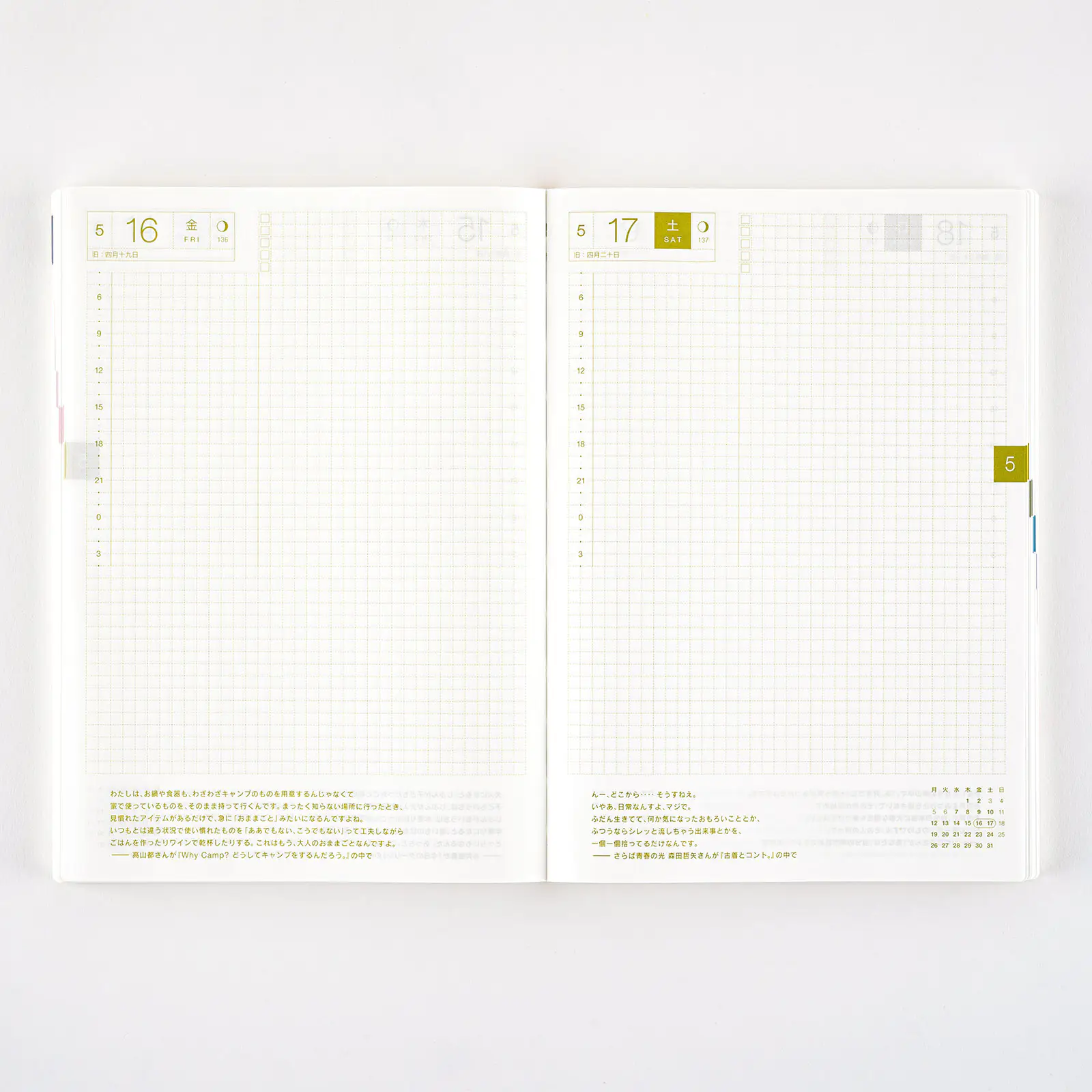 *右ページに「ミニカレンダー」を掲載(月曜もしくは日曜はじまり)。
