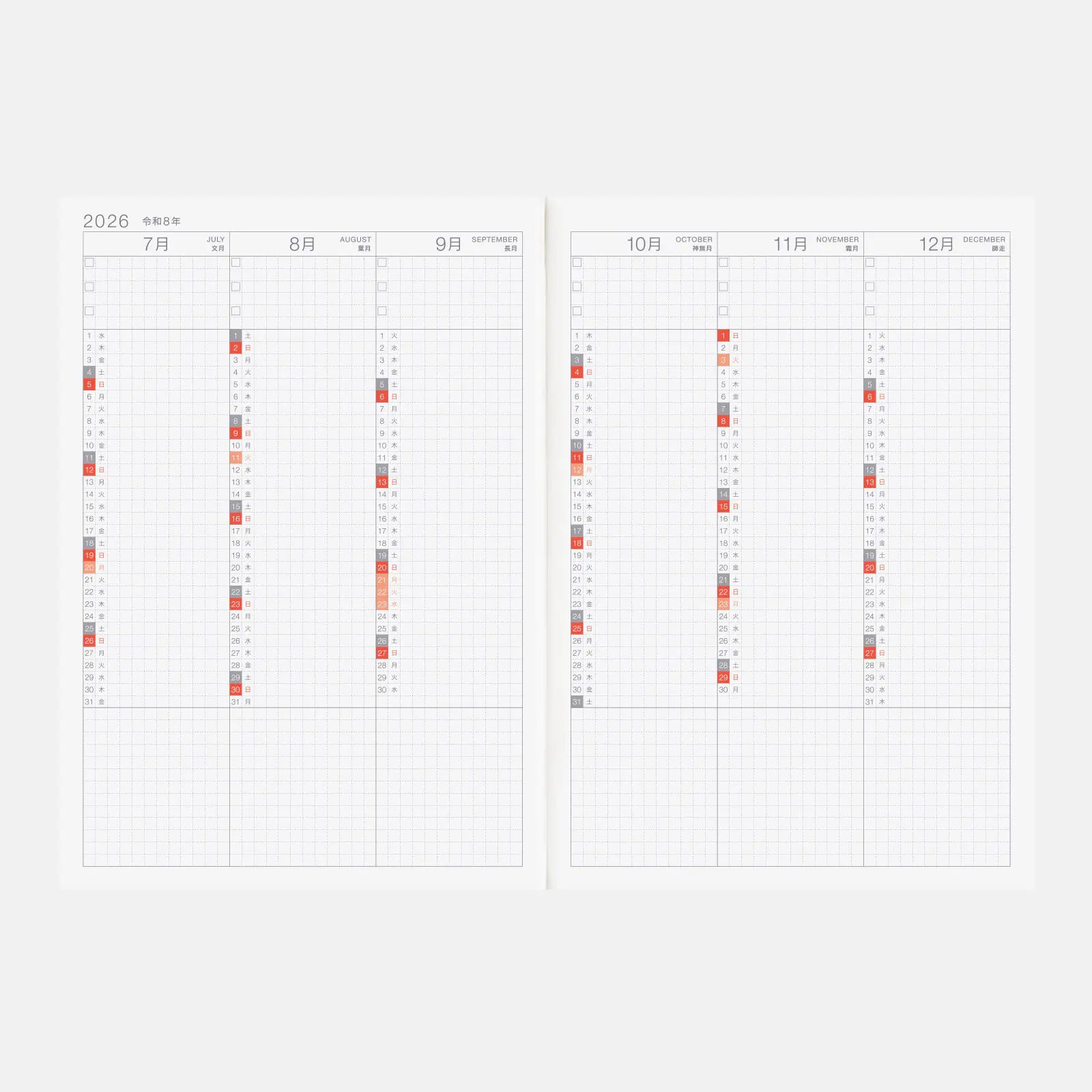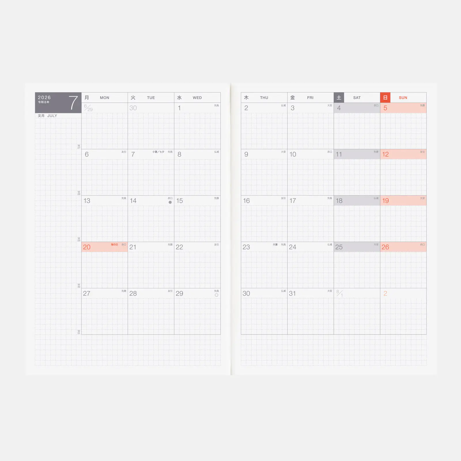記載される内容日番号/週番号(月間カレンダー・週間ダイアリーに記載)/旧暦/六曜(大安、仏滅など)(月間カレンダーに記載)/二十四節気(立春、春分、夏至など)、雑節/祝日、記念日など(聖バレンタインデー、ひな祭り、母の日、父の日など)/月の満ち欠け(1日ページ全ページに記載、月間カレンダー・週間ダイアリーに満月と新月のみ記載)