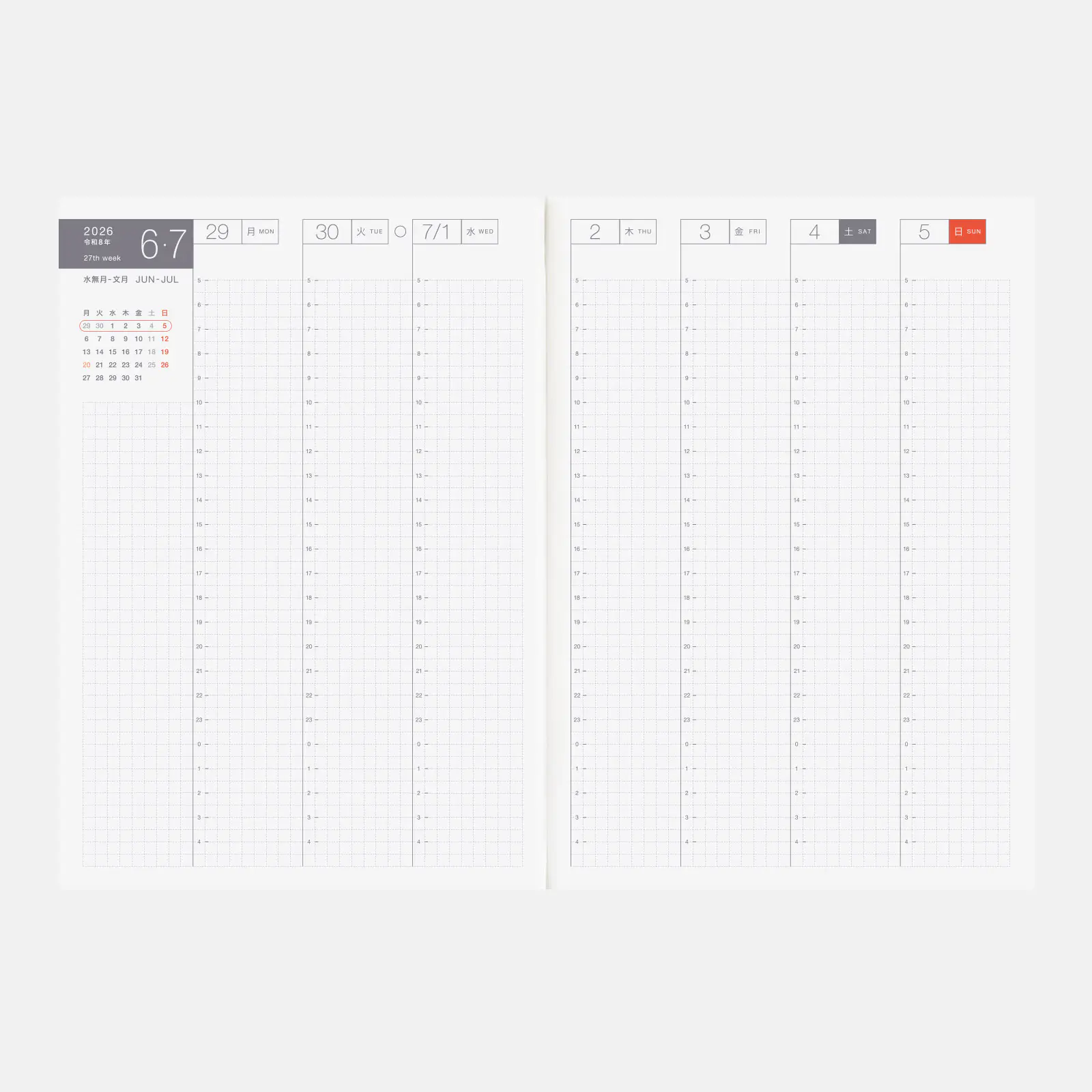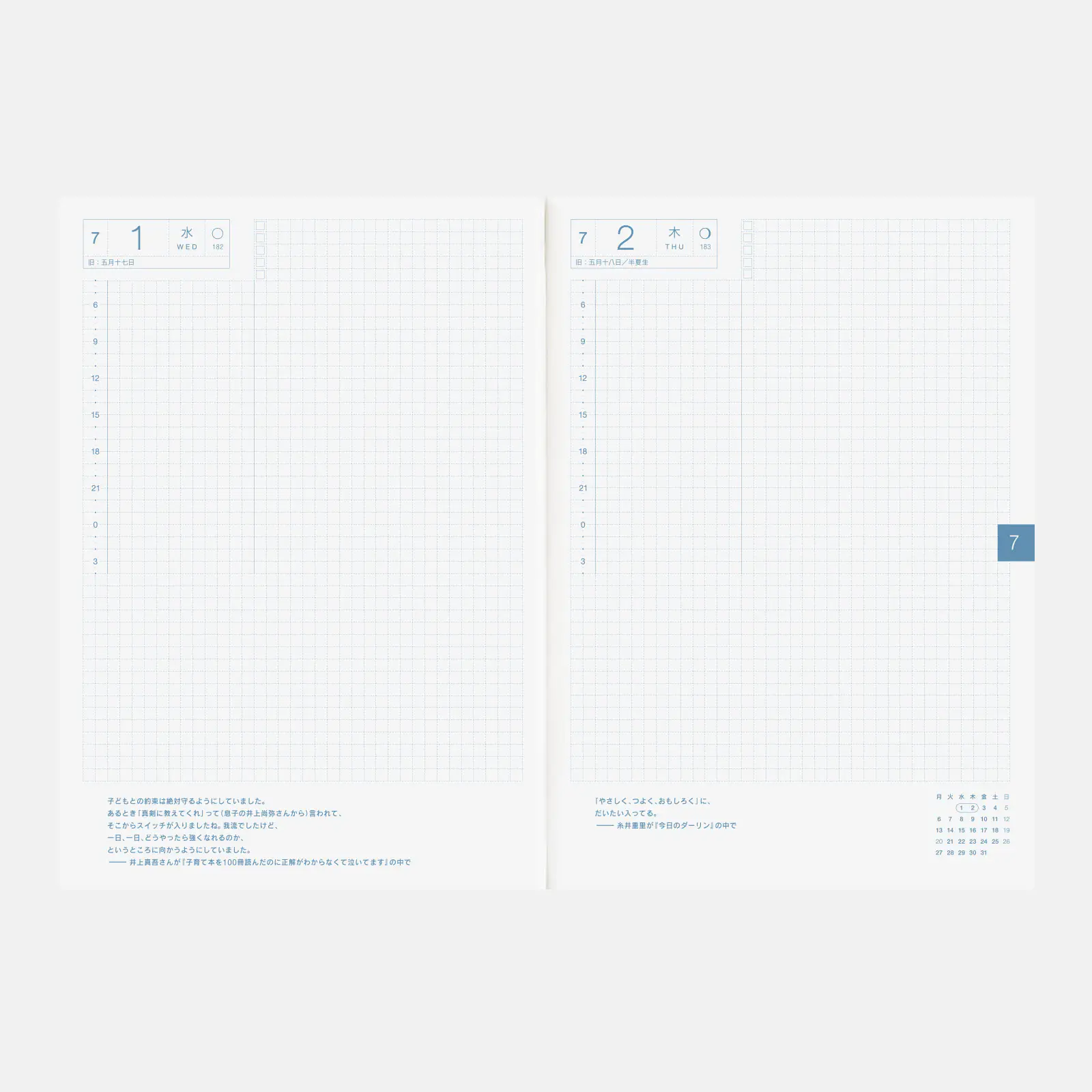 *右ページに「ミニカレンダー」を掲載(月曜はじまり)。
