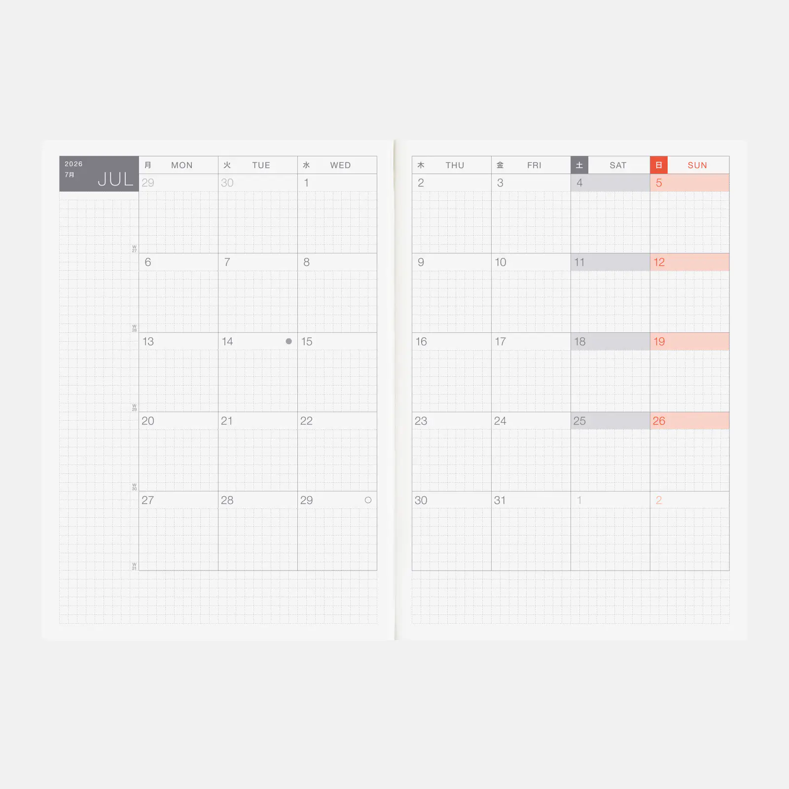 *右ページに「ミニカレンダー」を掲載(月曜はじまり)。