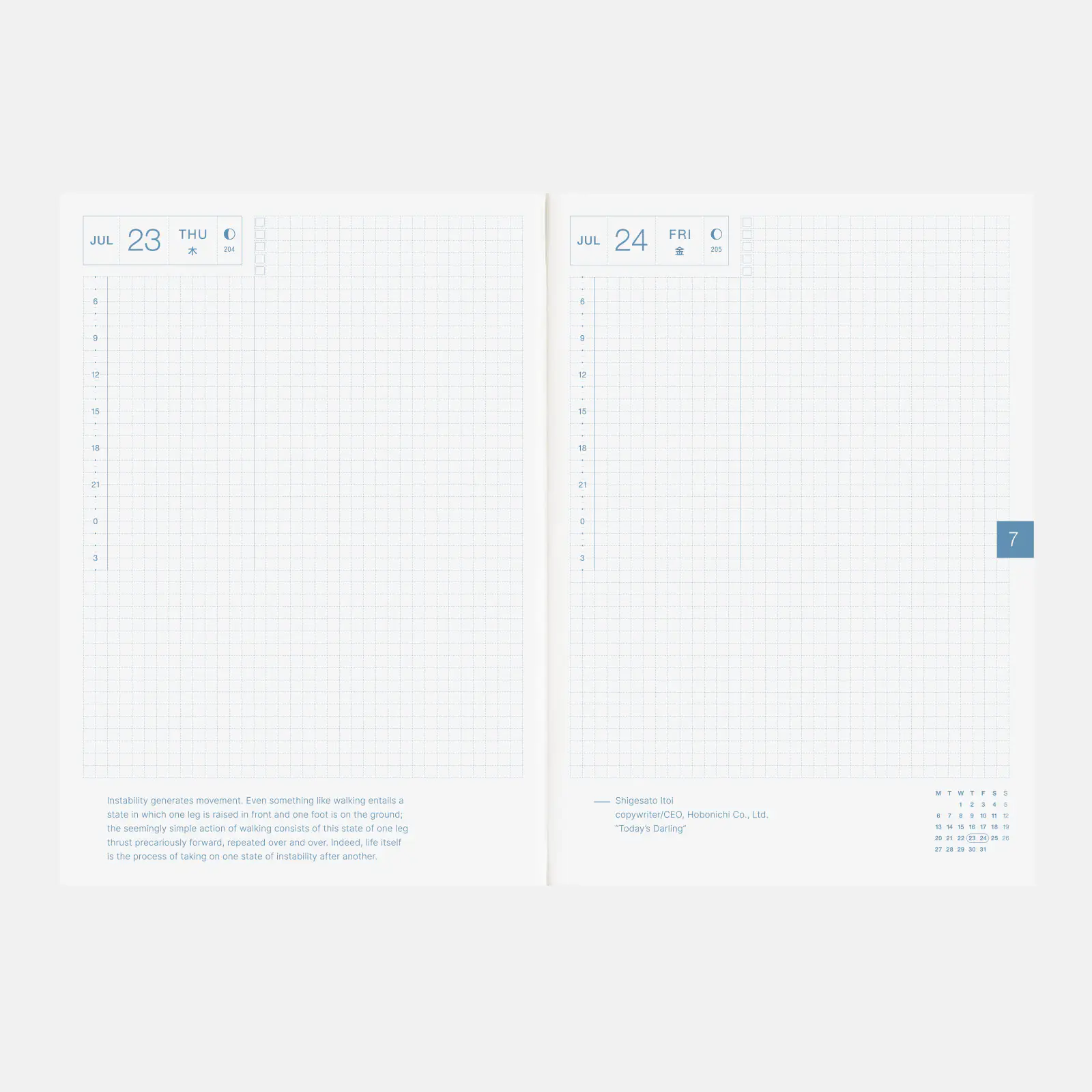 記載される内容日番号/週番号(月間カレンダー・週間ダイアリーに記載)/月の満ち欠け(1日ページ全ページに記載、月間カレンダー・週間ダイアリーに満月と新月のみ記載)