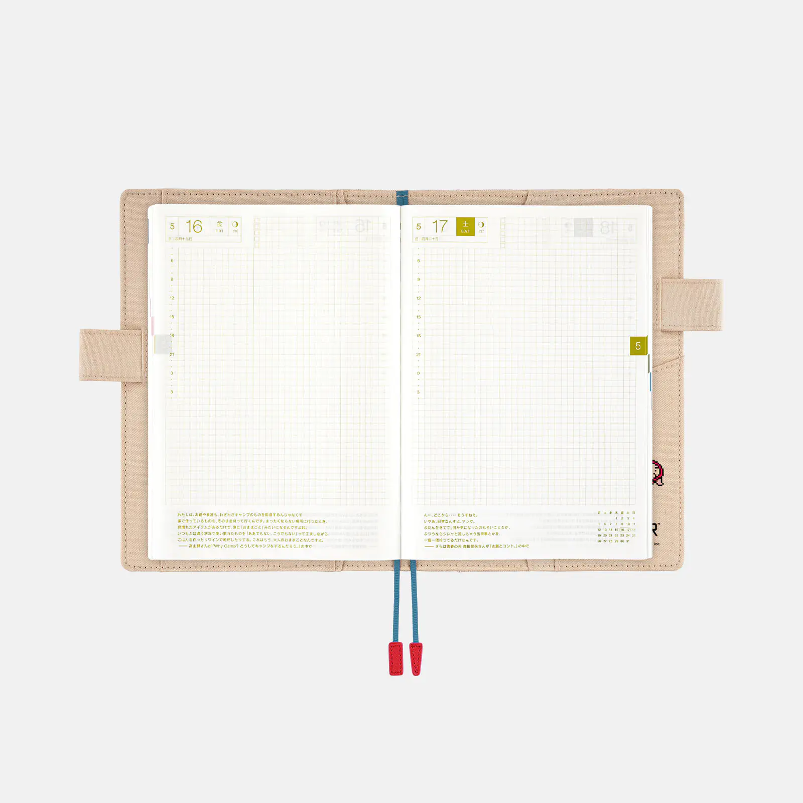 | 記載される内容 | 日番号/週番号(月間カレンダー・週間ダイアリーに記載)/月の満ち欠け(1日ページ全ページに記載、月間カレンダー・週間ダイアリーに満月と新月のみ記載) |