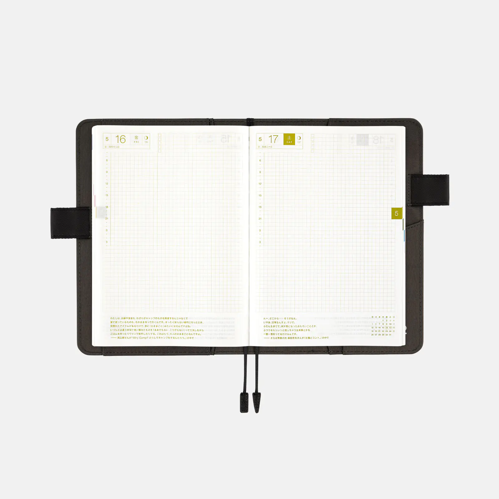 巻頭にはマンスリーのカレンダー、残りは方眼ノートページの手帳。日付にとらわれず、書きたいときに好きなだけ書ける自由度の高い手帳です。