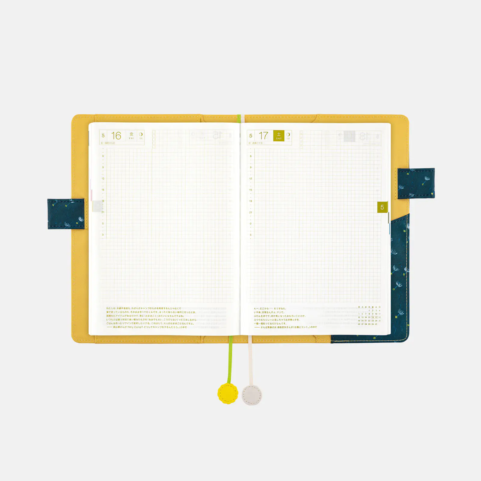 | 記載される内容 | 日番号/週番号(月間カレンダー・週間ダイアリーに記載)/月の満ち欠け(1日ページ全ページに記載、月間カレンダー・週間ダイアリーに満月と新月のみ記載) |