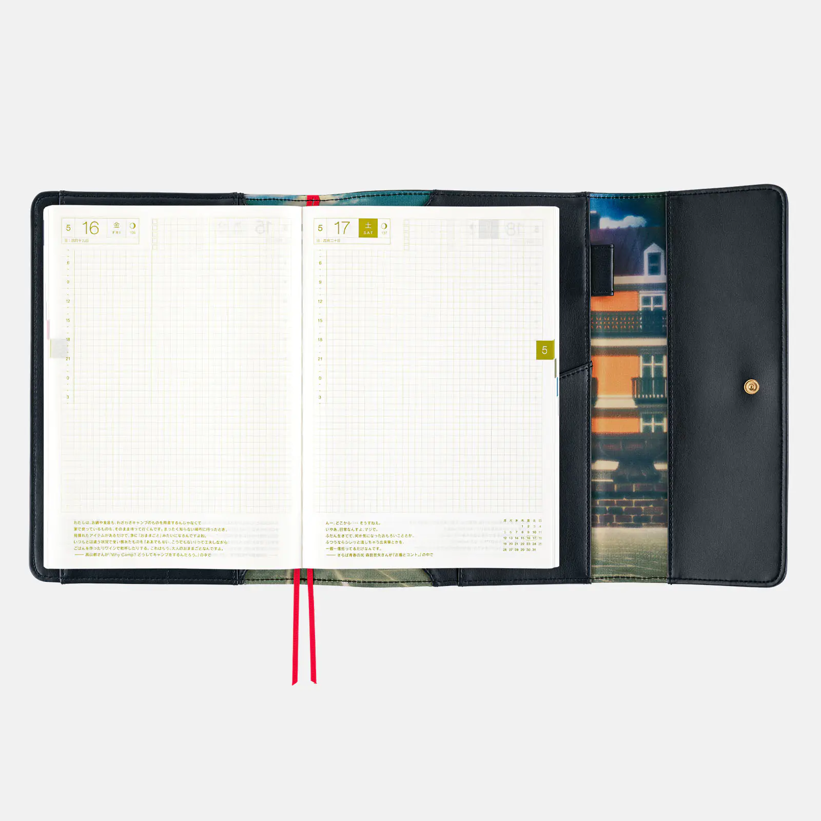 | 記載される内容 | 日番号/週番号(月間カレンダー・週間ダイアリーに記載)/月の満ち欠け(1日ページ全ページに記載、月間カレンダー・週間ダイアリーに満月と新月のみ記載) |