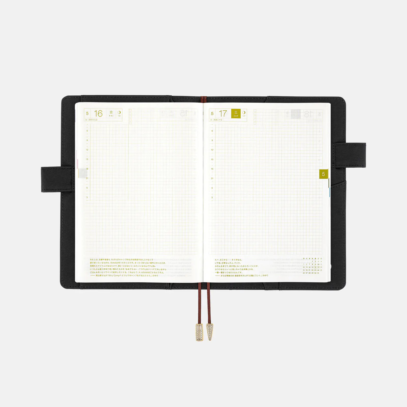 | 記載される内容 | 日番号/週番号(月間カレンダー・週間ダイアリーに記載)/月の満ち欠け(1日ページ全ページに記載、月間カレンダー・週間ダイアリーに満月と新月のみ記載) |