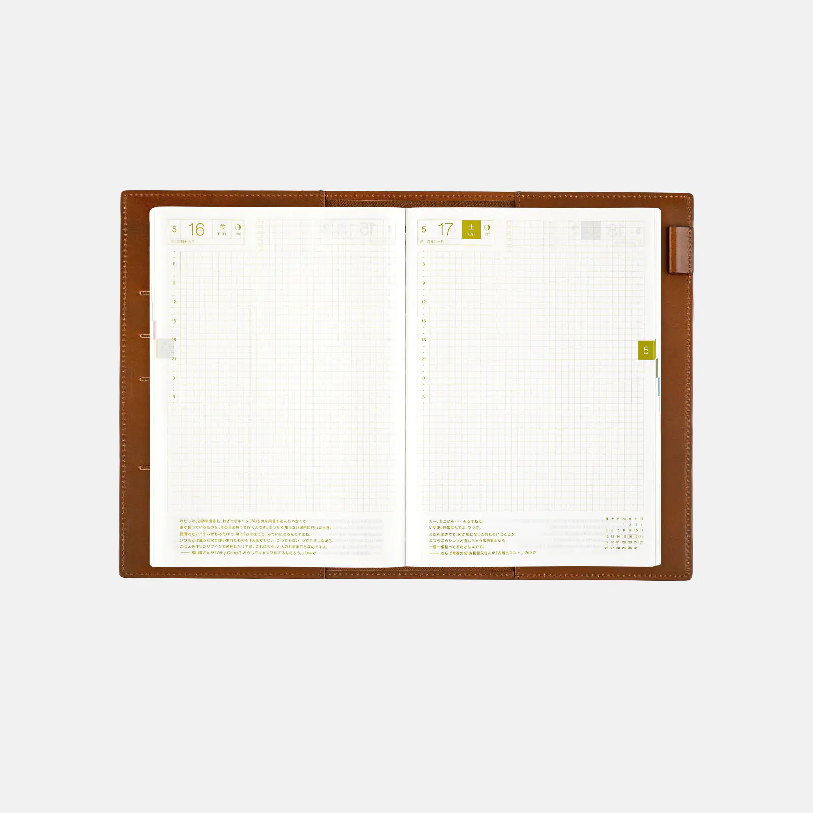巻頭にはマンスリーのカレンダー、残りは方眼ノートページの手帳。日付にとらわれず、書きたいときに好きなだけ書ける自由度の高い手帳です。
