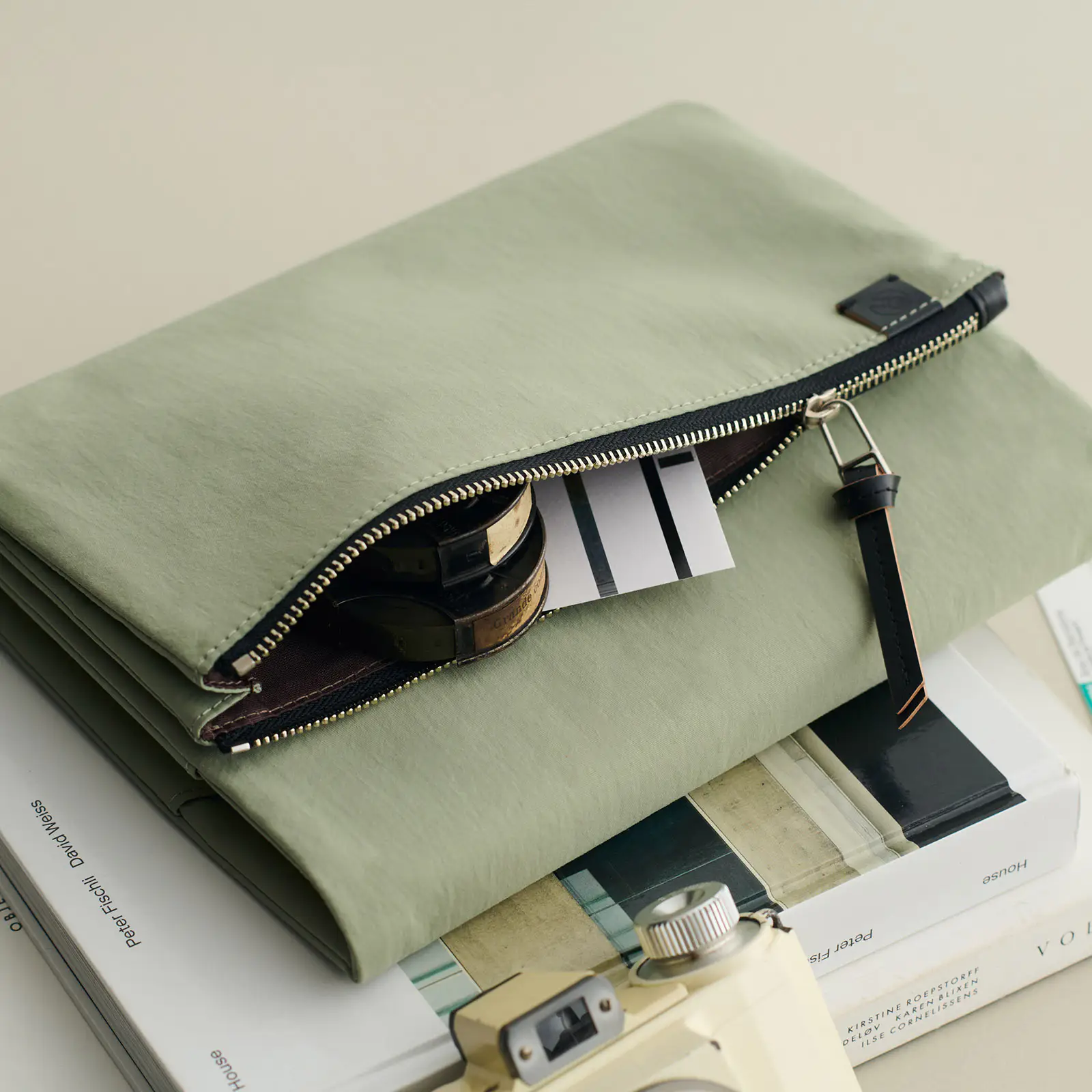 表のポケットには、レザーの引き手がついています。
