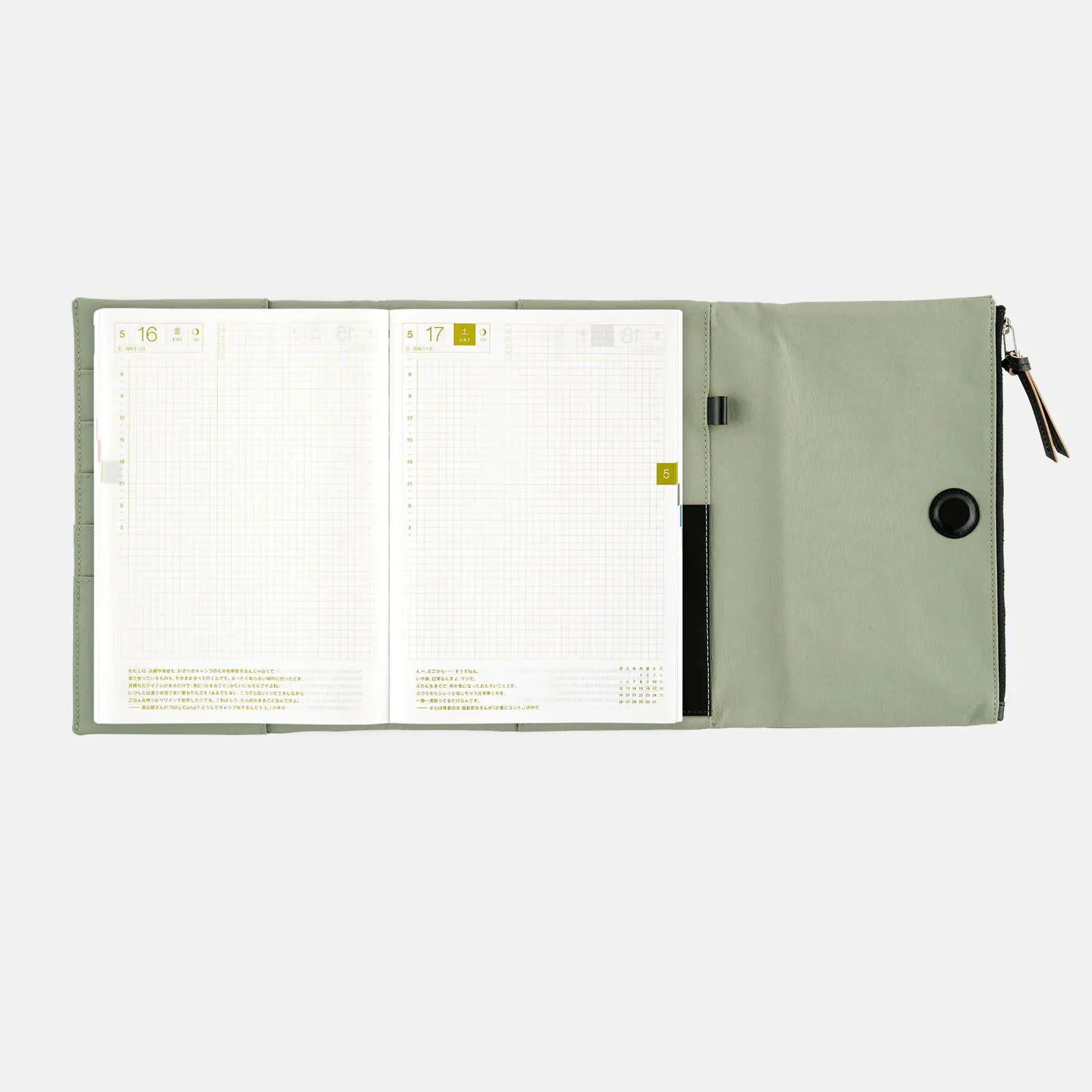 | 記載される内容 | 日番号/週番号(月間カレンダー・週間ダイアリーに記載)/月の満ち欠け(1日ページ全ページに記載、月間カレンダー・週間ダイアリーに満月と新月のみ記載) |