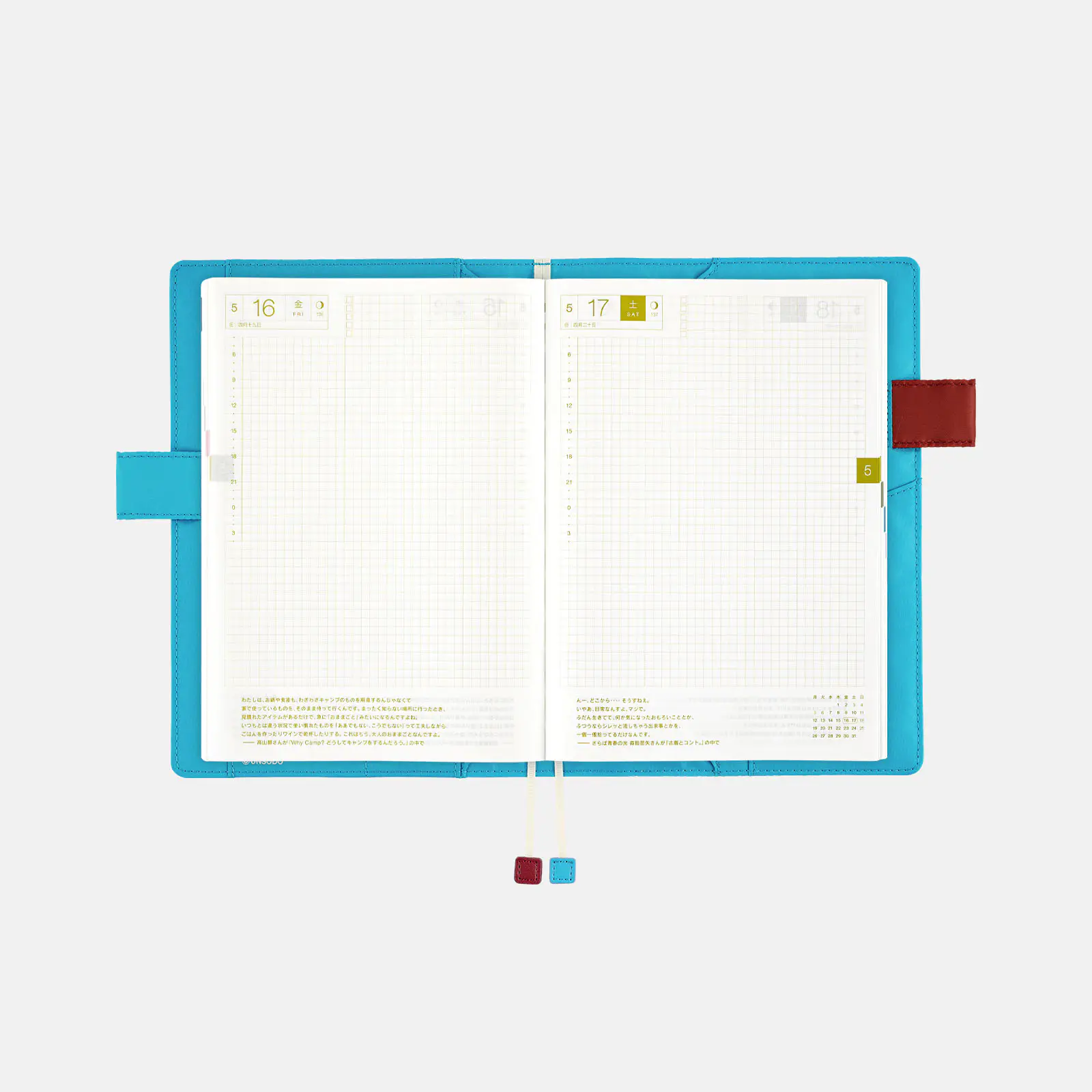 | 記載される内容 | 日番号/週番号(月間カレンダー・週間ダイアリーに記載)/月の満ち欠け(1日ページ全ページに記載、月間カレンダー・週間ダイアリーに満月と新月のみ記載) |