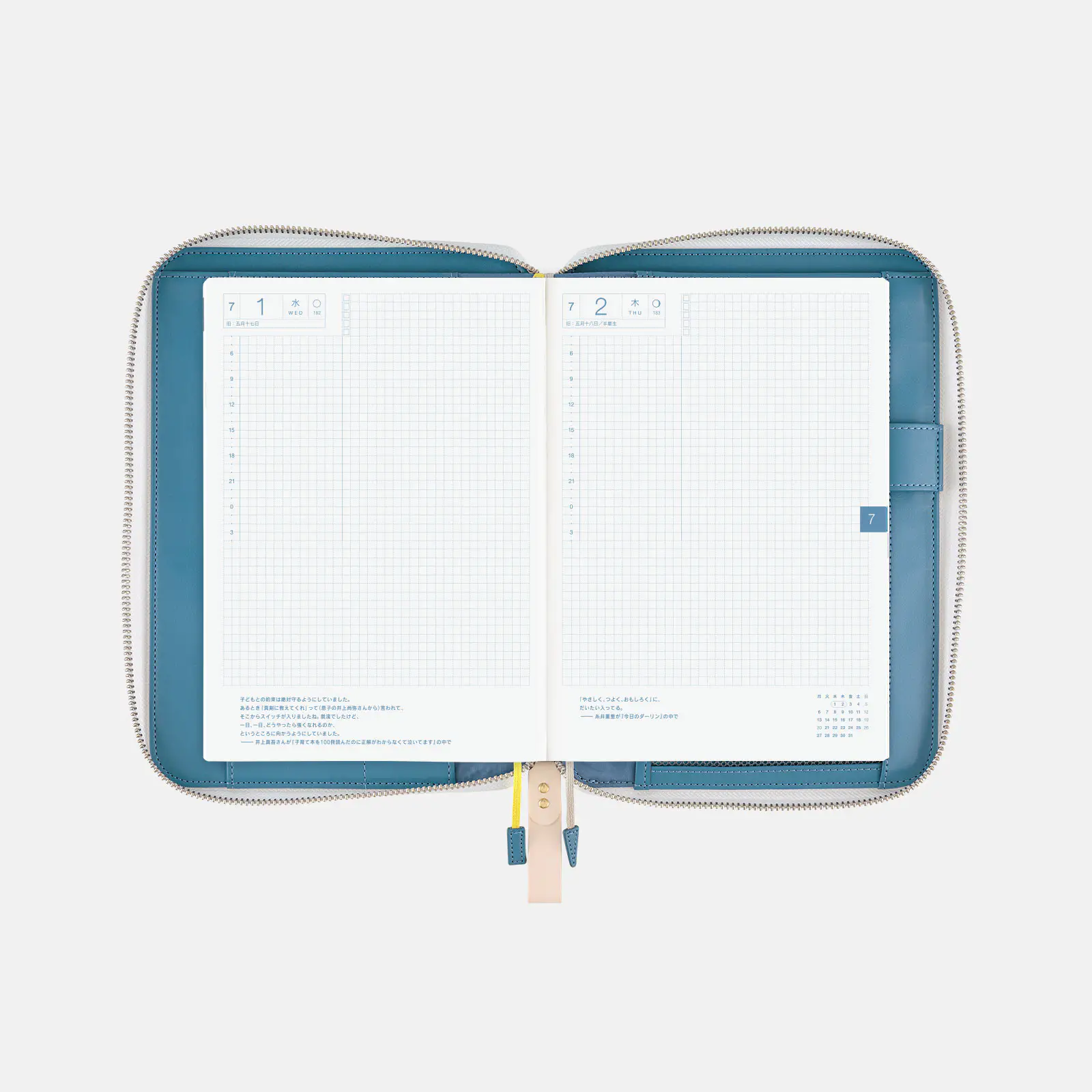 | 記載される内容 | 日番号/週番号(月間カレンダー・週間ダイアリーに記載)/月の満ち欠け(1日ページ全ページに記載、月間カレンダー・週間ダイアリーに満月と新月のみ記載) |