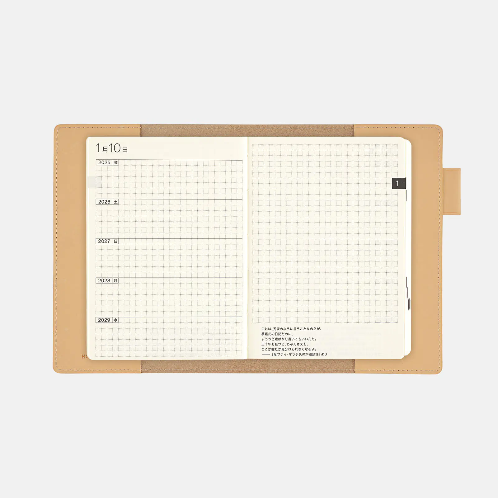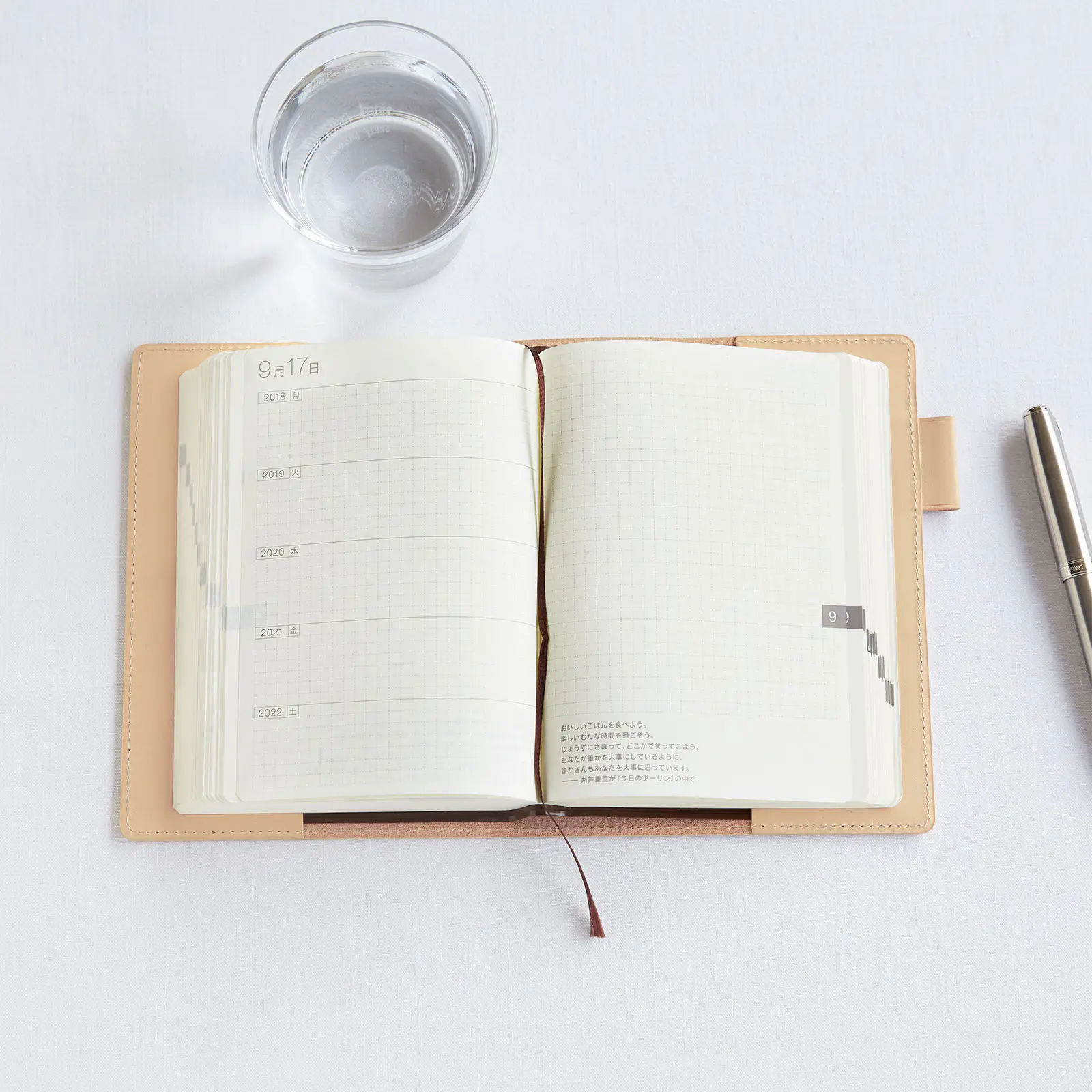 | 紙質・製本 | 薄くて軽く、なめらかな書き心地のトモエリバー(手帳専用紙)/糸かがり製本 |