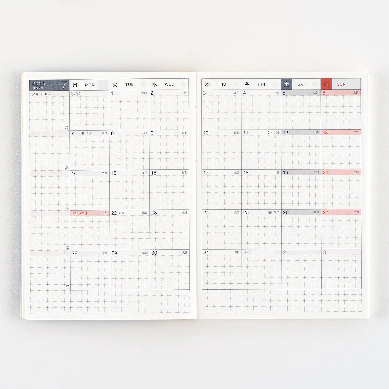 記載される内容日番号/週番号(月間カレンダーに記載)/旧暦/六曜(大安、仏滅など)(月間カレンダーに記載)/二十四節気(立春、春分、夏至など)、雑節/祝日、記念日など(バレンタインデー、ひなまつり、母の日、父の日など)/月の満ち欠け(月間カレンダーに満月と新月のみ記載)