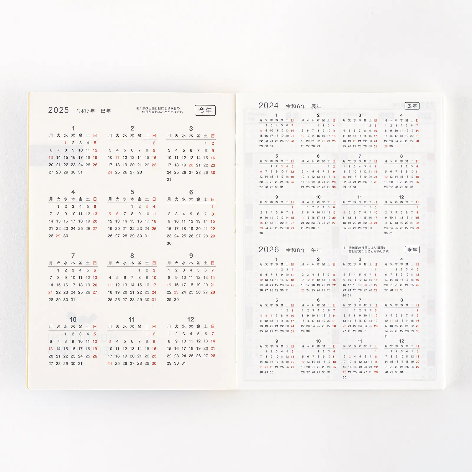 年間カレンダー2024年、2025年、2026年