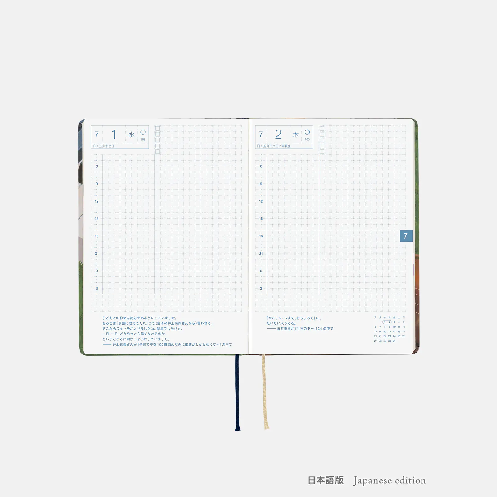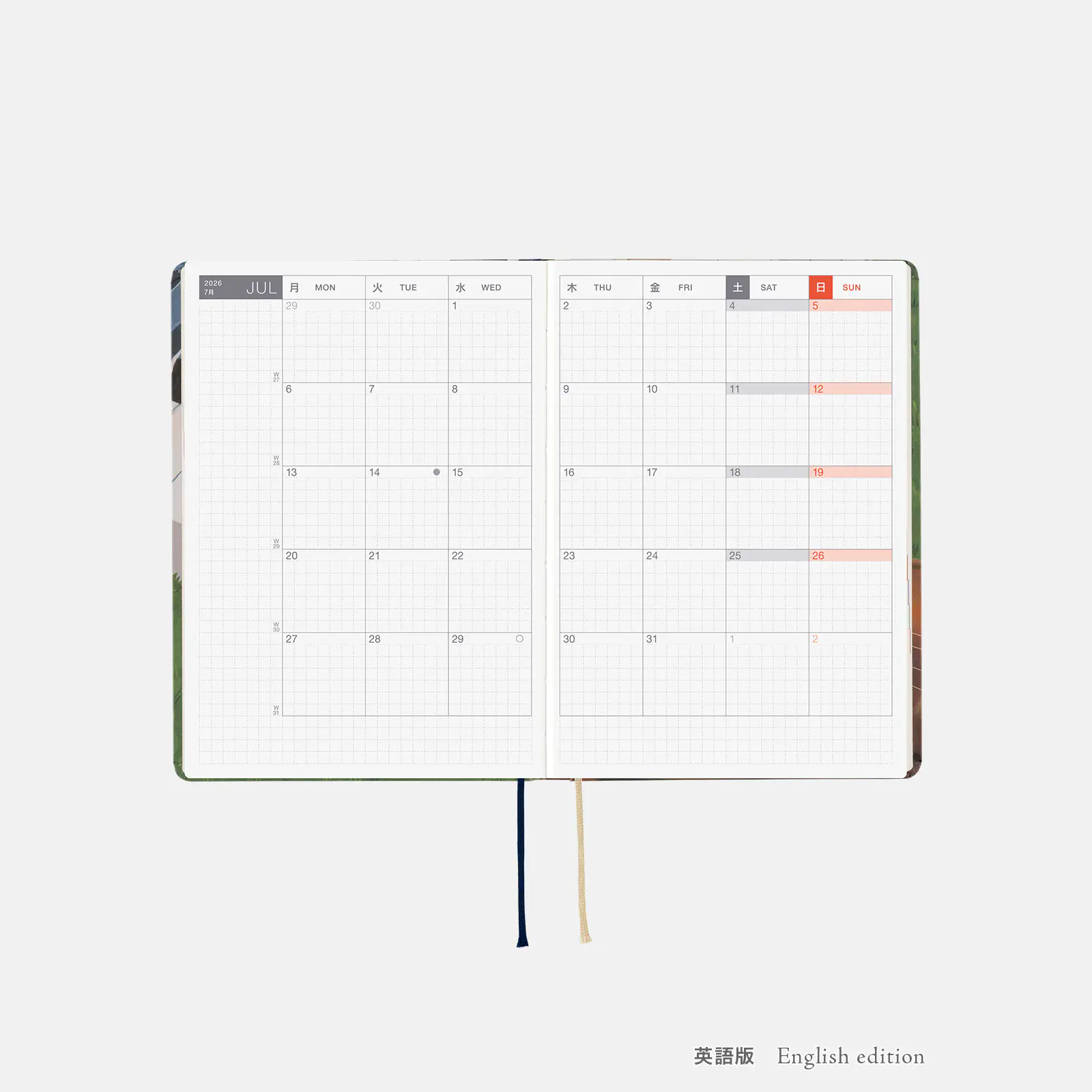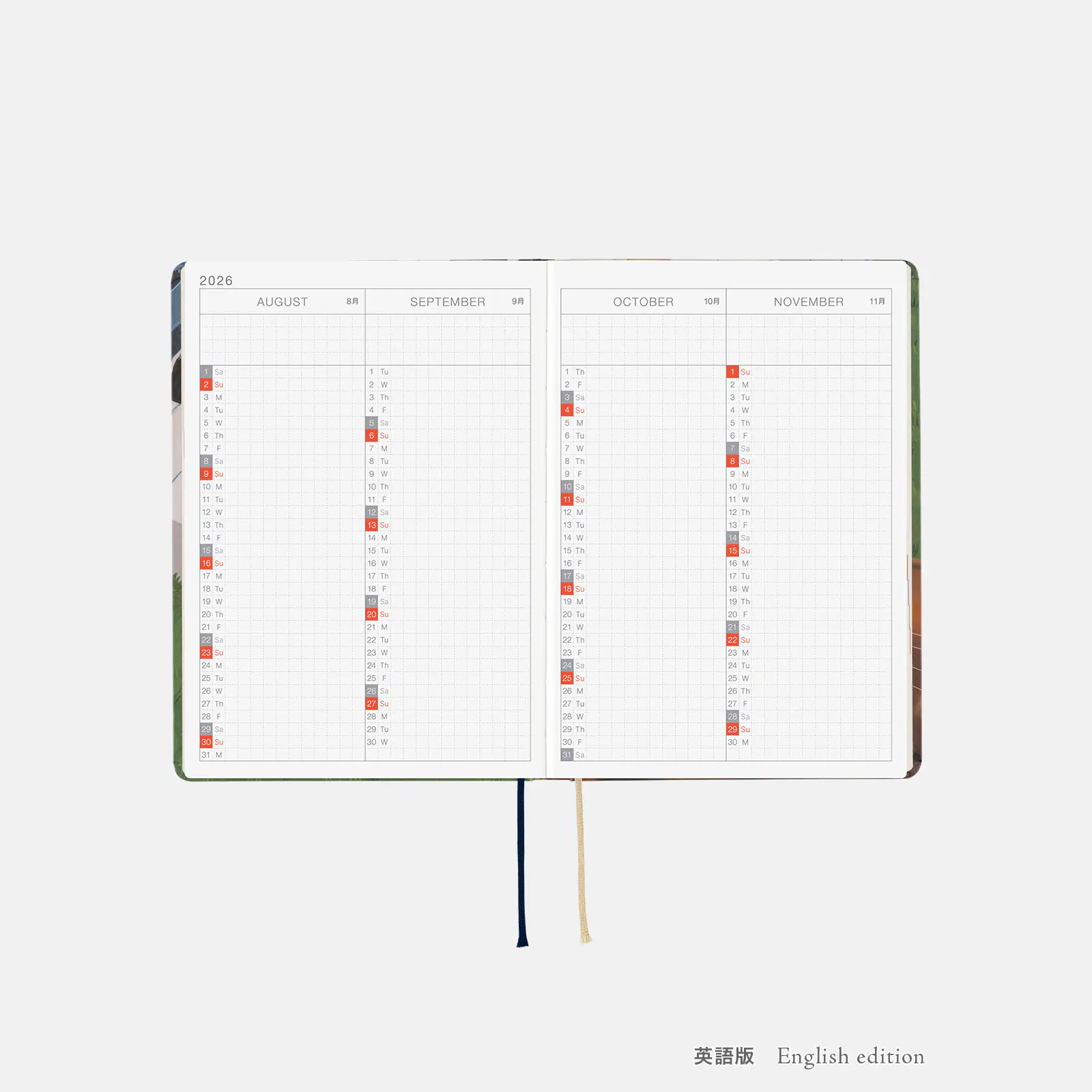 | 1日ページ | 2026年1月1日〜12月31日(全377ページ ) *各月のはじめに、「ことしの歳時記」と、その月のことをまとめて書ける扉ページ(1ページ)があります。 *すべてのページに「日々の言葉」を掲載。 *右ページに「ミニカレンダー」を掲載(月曜もしくは日曜はじまり)。 *このほか、1日ページのはじめに、自由に使える「Turning the page to a new year」(2ページ)があります。 |