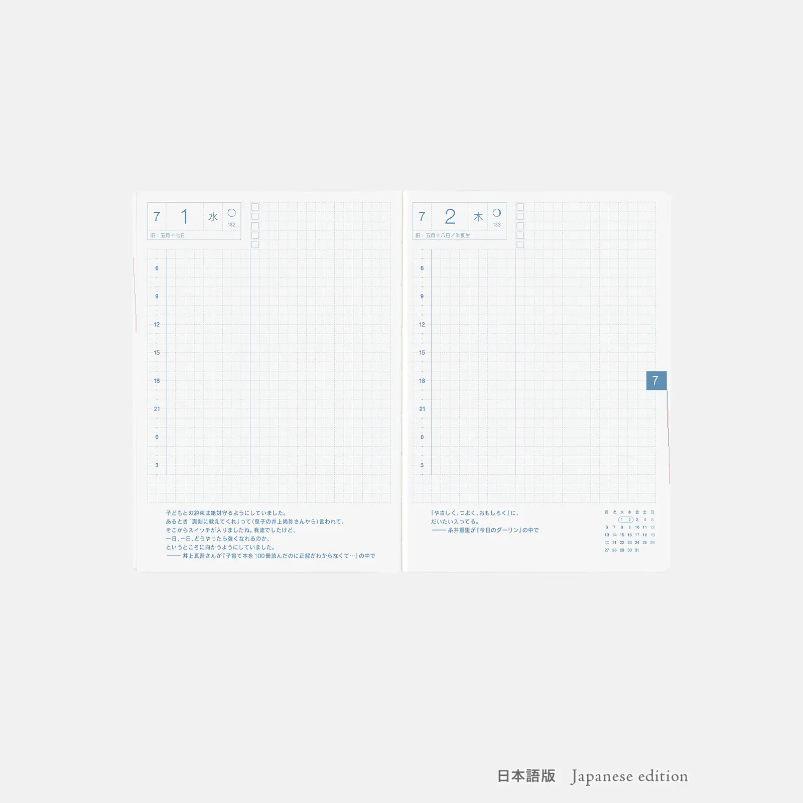 | 記載される内容 | 日番号/週番号(月間カレンダーに記載)/月の満ち欠け(1日ページ全ページに記載、月間カレンダーに満月と新月のみ記載) |