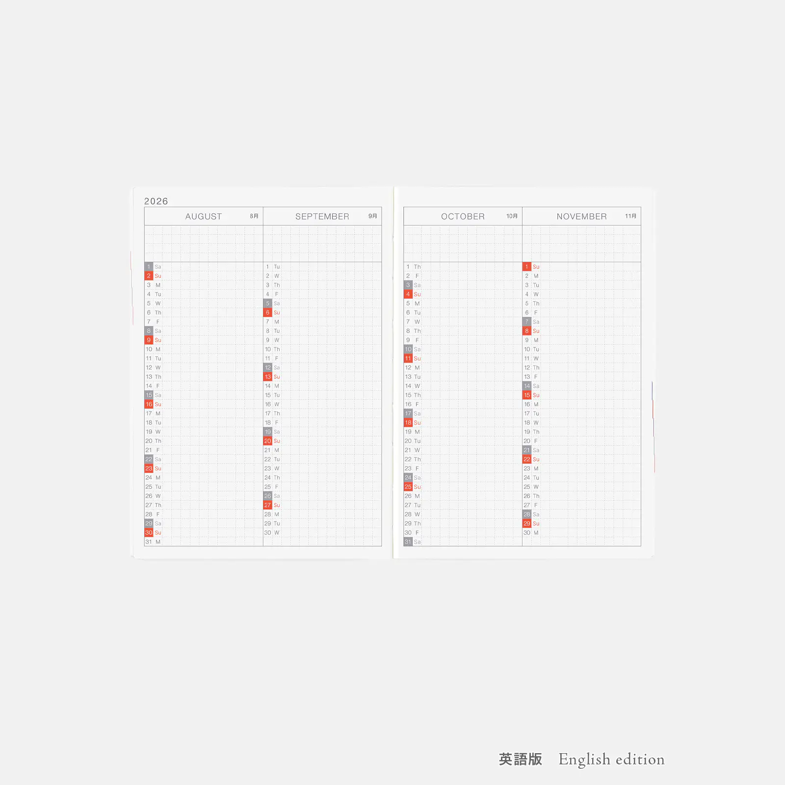 | おまけページ | Time Table / Graph Paper / Favorites / My 100 / Memories 2026 / 12 Switches to Help You Focus / For a Comfortable Night’s Sleep / Words to Remember / 365 Days Check-Off Sheet / Looking Back at the Year 2026 / Getting the Most Out of Your Hobonichi Techo / Gifts / Addresses / Personal Notes |