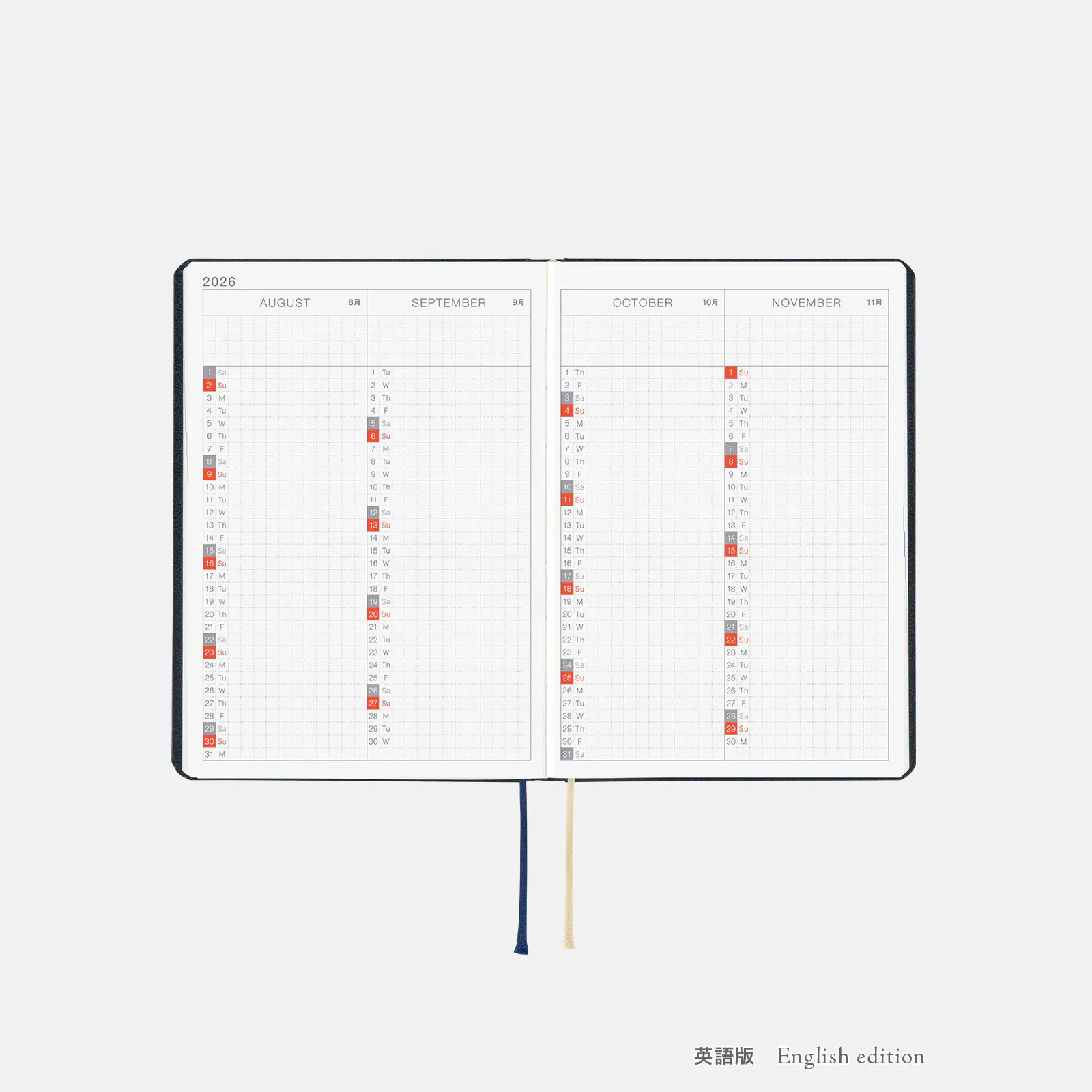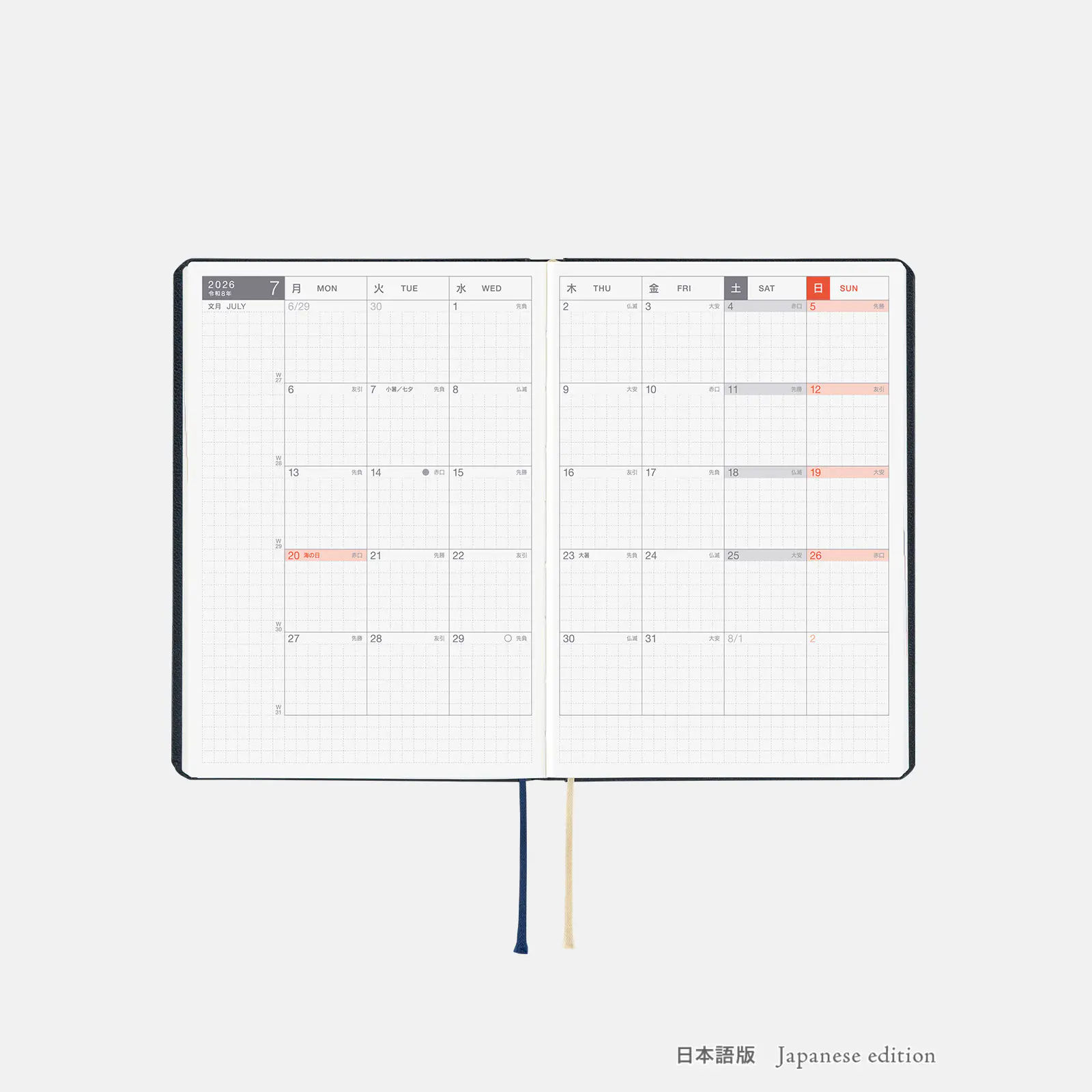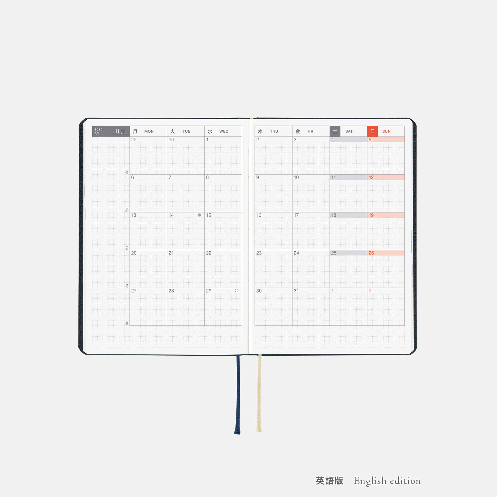 | 1日ページ | 2026年1月1日〜12月31日(全377ページ ) *各月のはじめに、「ことしの歳時記」と、その月のことをまとめて書ける扉ページ(1ページ)があります。 *すべてのページに「日々の言葉」を掲載。 *右ページに「ミニカレンダー」を掲載(月曜もしくは日曜はじまり)。 *このほか、1日ページのはじめに、自由に使える「Turning the page to a new year」(2ページ)があります。 |