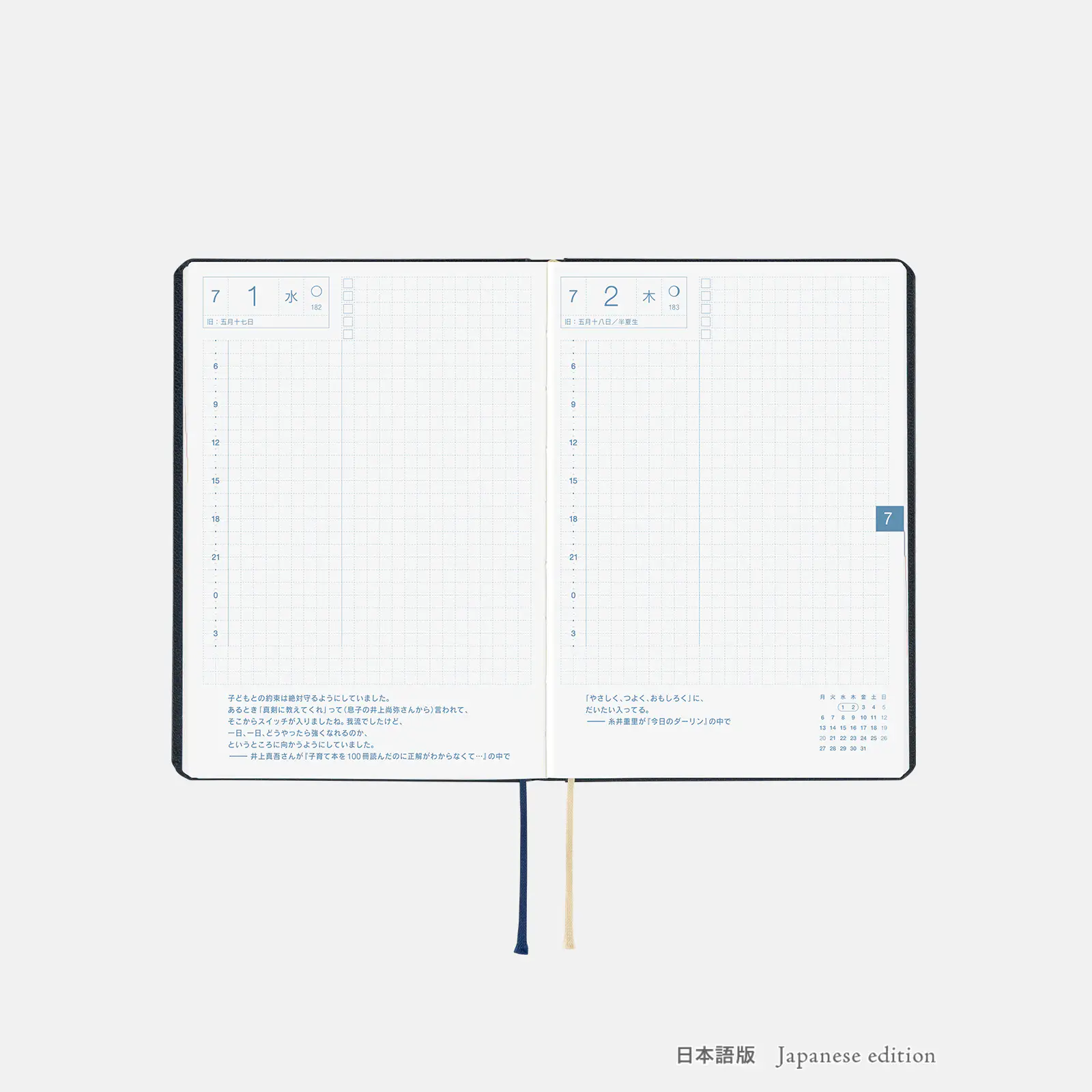 | 記載される内容 | 日番号/週番号(月間カレンダーに記載)/月の満ち欠け(1日ページ全ページに記載、月間カレンダーに満月と新月のみ記載) |