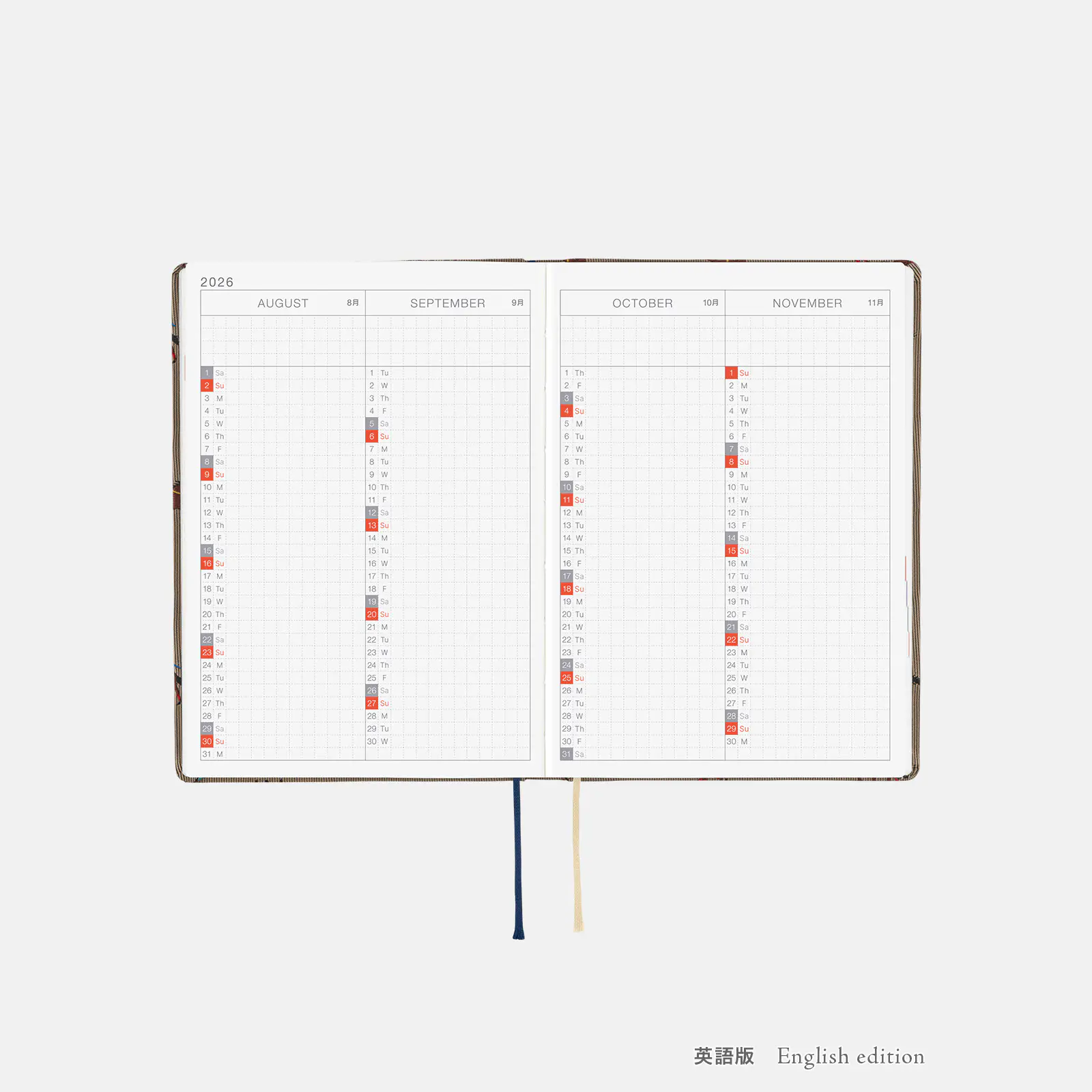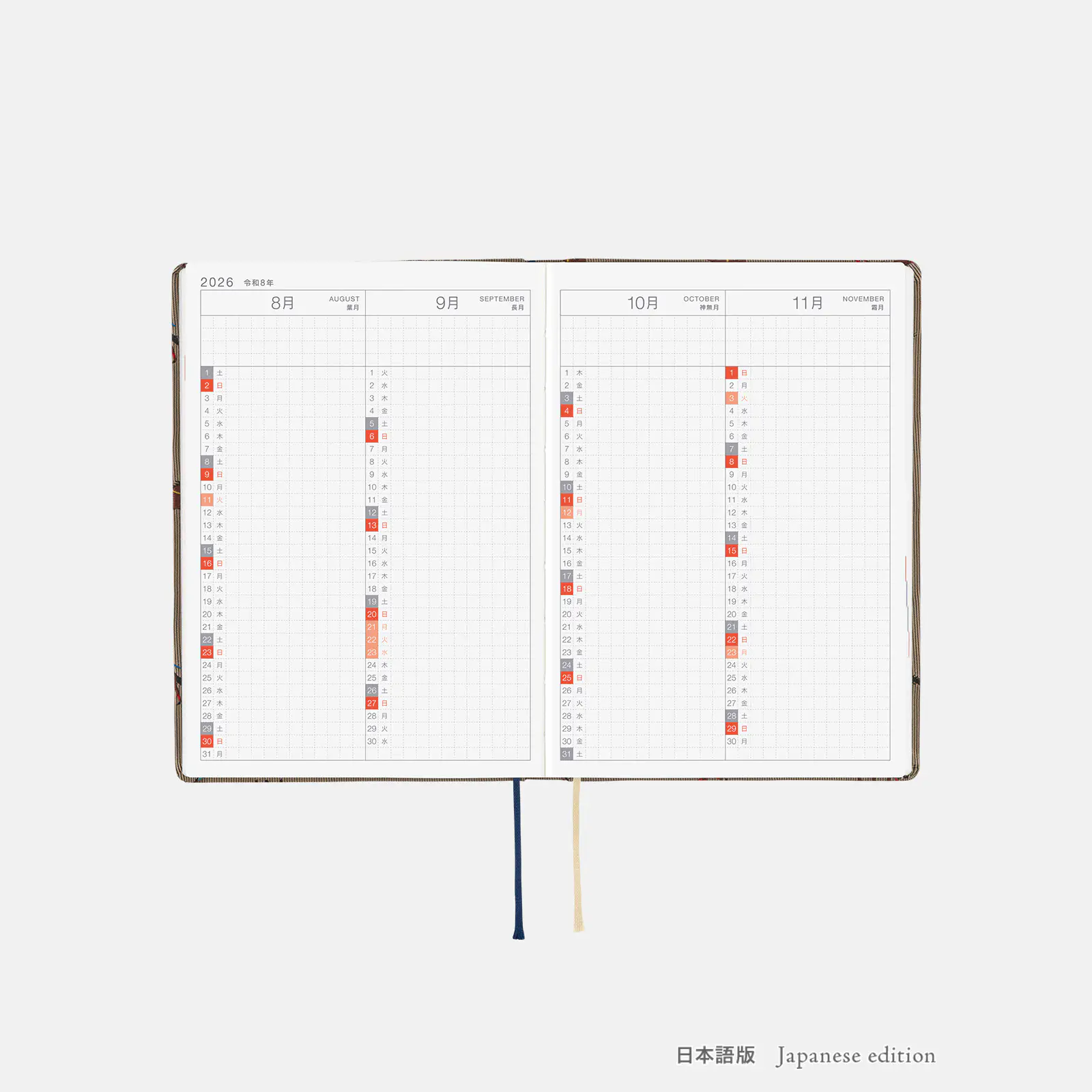 *右ページに「ミニカレンダー」を掲載(月曜もしくは日曜はじまり)。
