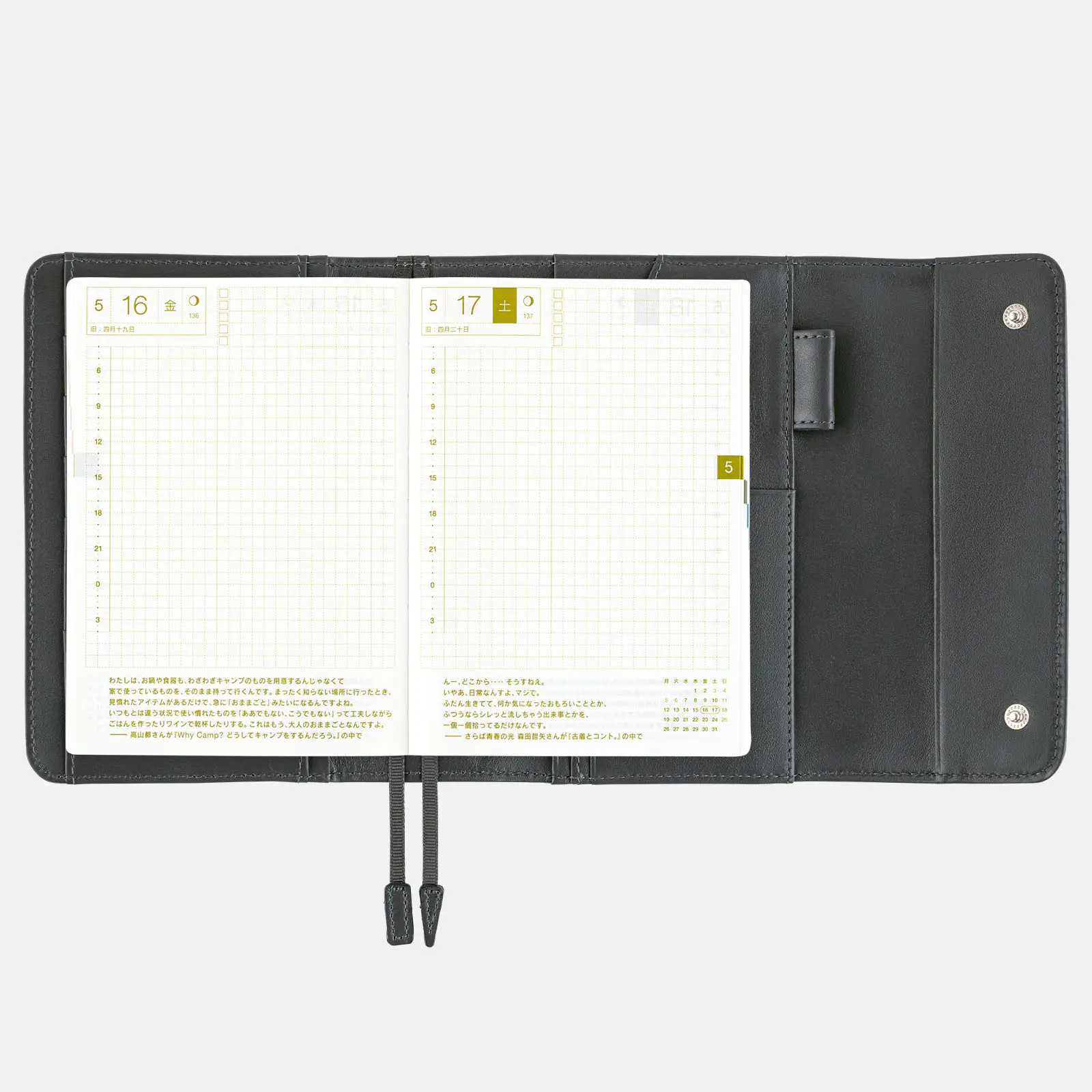 | 記載される内容 | 日番号/週番号(月間カレンダーと1日ページに記載)/月の満ち欠け(1日ページ全ページに記載・月間カレンダーに満月と新月のみ記載) |