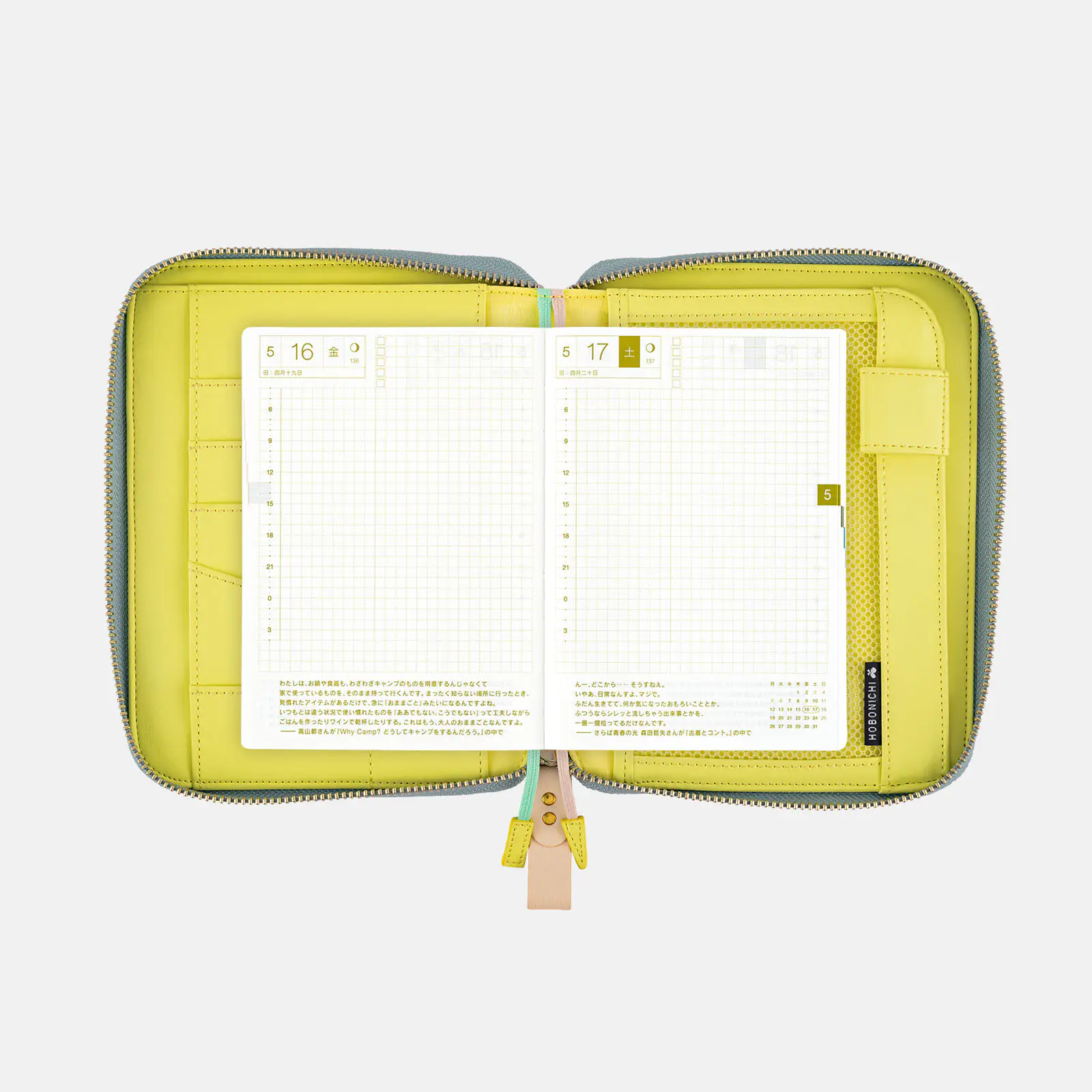 | 記載される内容 | 日番号/週番号(月間カレンダーと1日ページに記載)/月の満ち欠け(1日ページ全ページに記載・月間カレンダーに満月と新月のみ記載) |