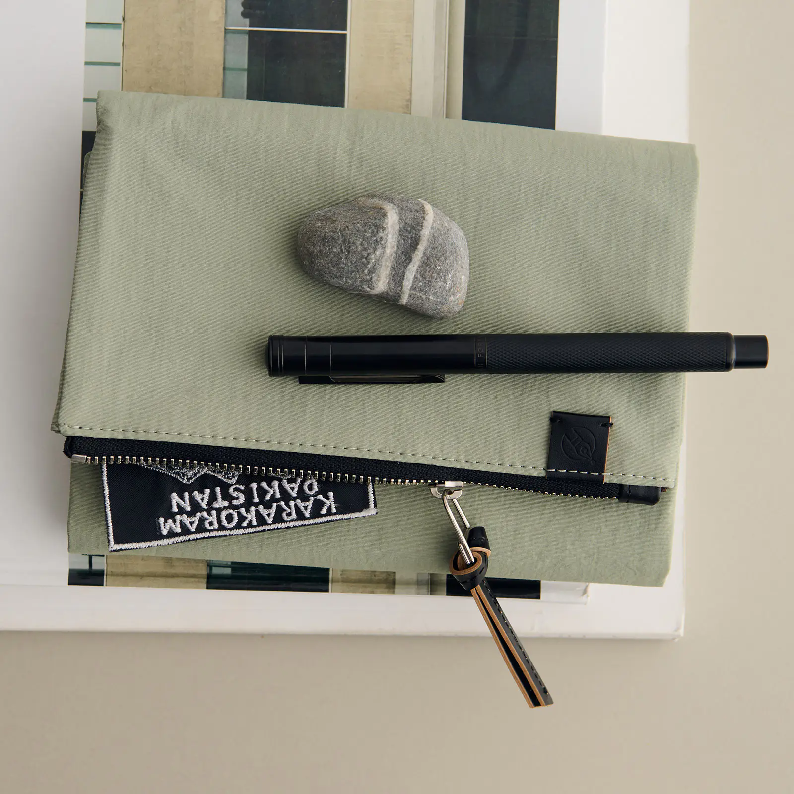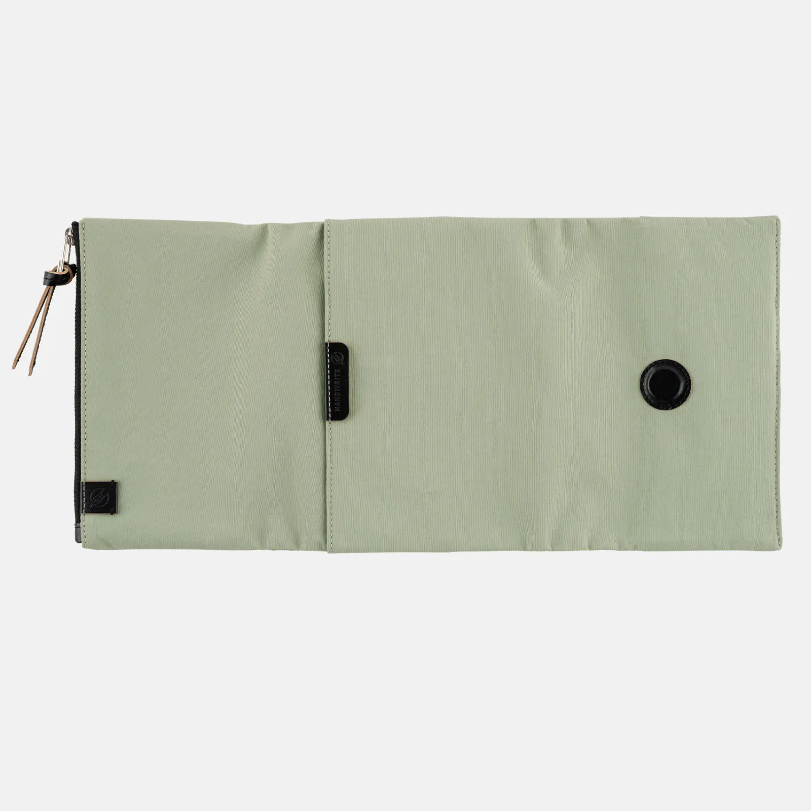 表のポケットには、レザーの引き手がついています。