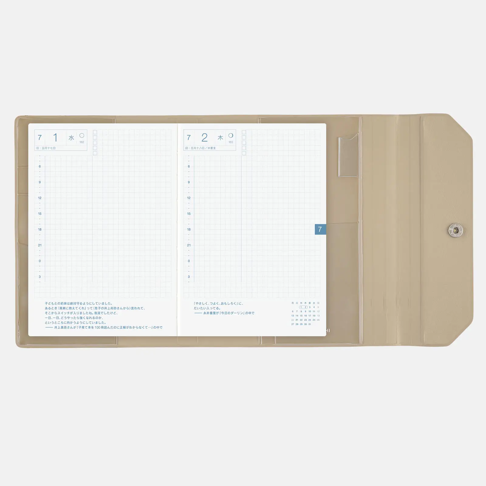| 1日ページ | 前期 : 2026年1月1日〜6月30日(全187ページ) 後期 : 2026年7月1日〜12月31日(全190ページ) *各月のはじめに、「ことしの歳時記」と、その月のことをまとめて書ける扉ページ(1ページ)があります。 *すべてのページに「日々の言葉」を掲載。 *右ページに「ミニカレンダー」を掲載(月曜はじまり)。 *このほか、1日ページのはじめに、自由に使える「Turning the page to a new year」(前期:2ページ、後期:3ページ)があります。 |